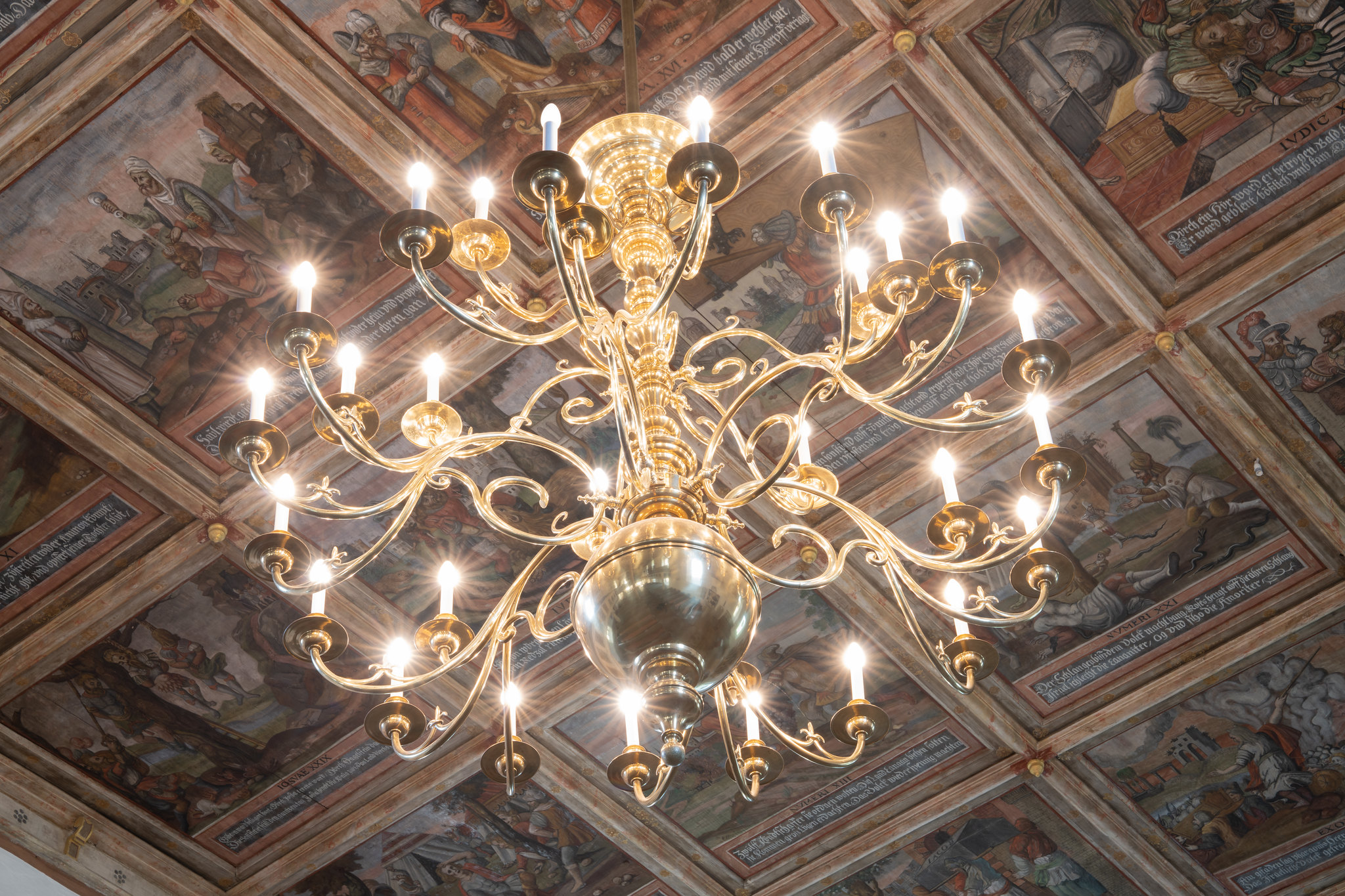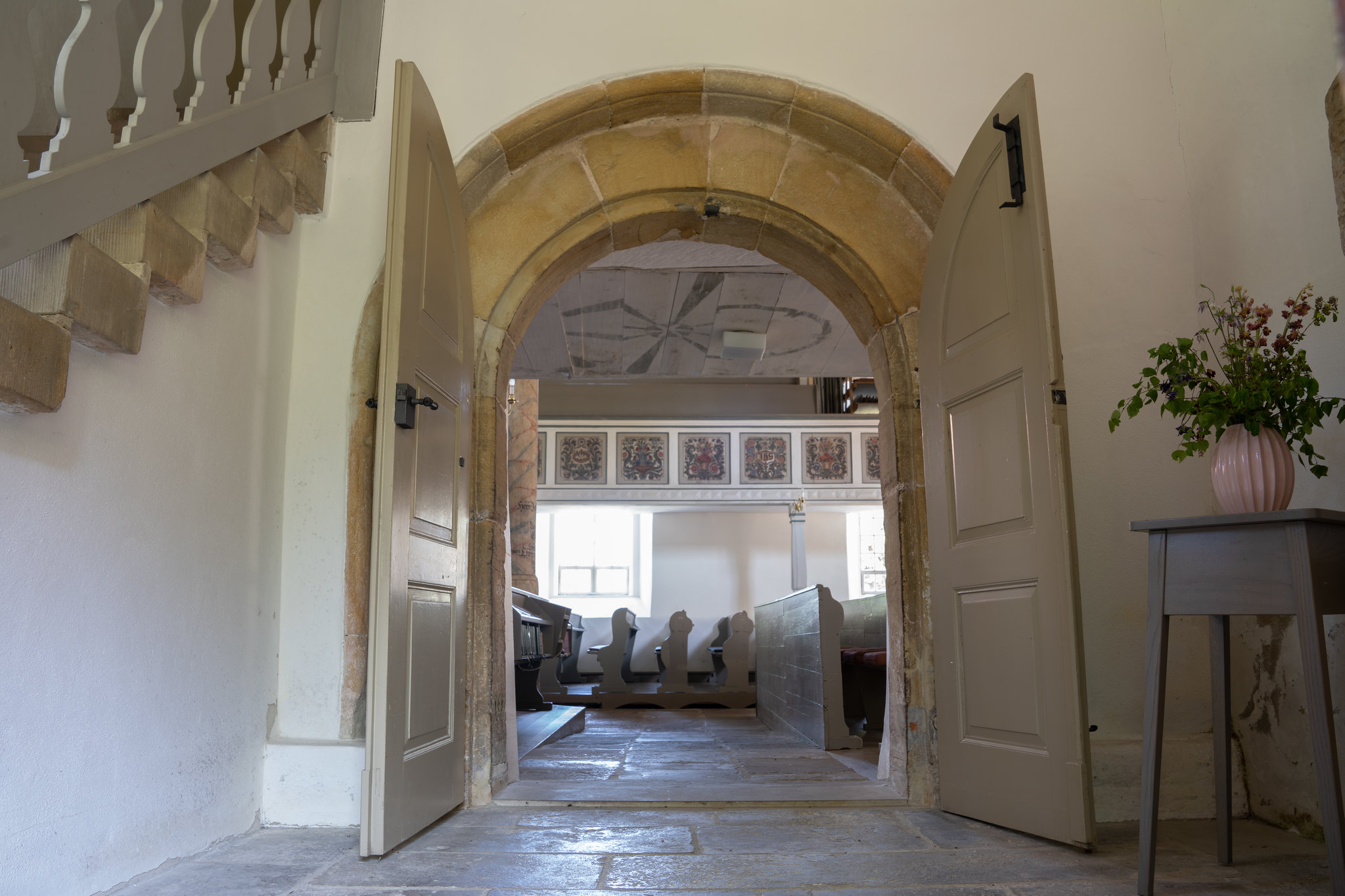 Kirche wahrscheinlich vor 1200 entstanden, romanisches Türgewände im Haupteingang, Kassettendecke mit 96 Bildern zu biblischen Geschichten.