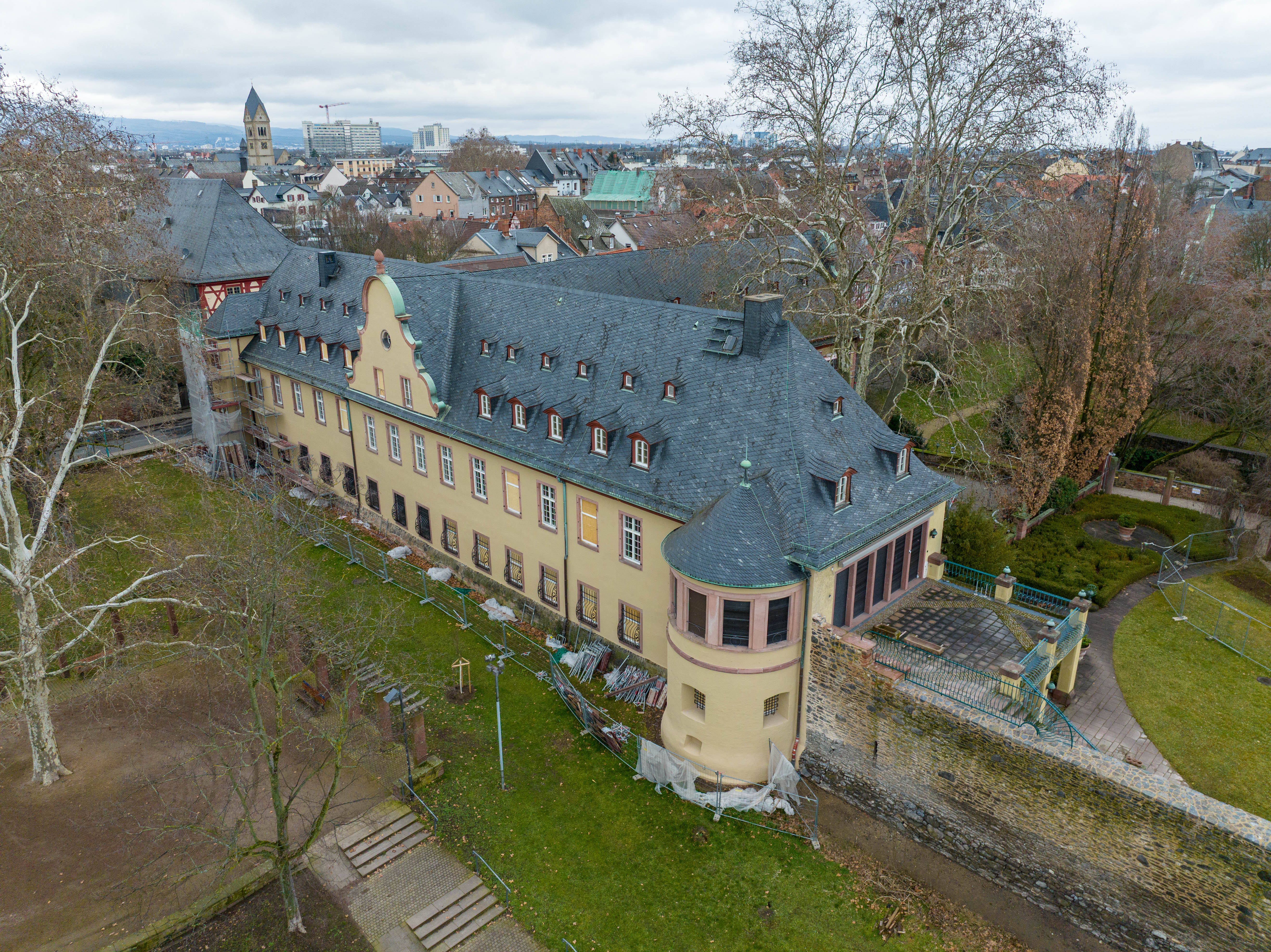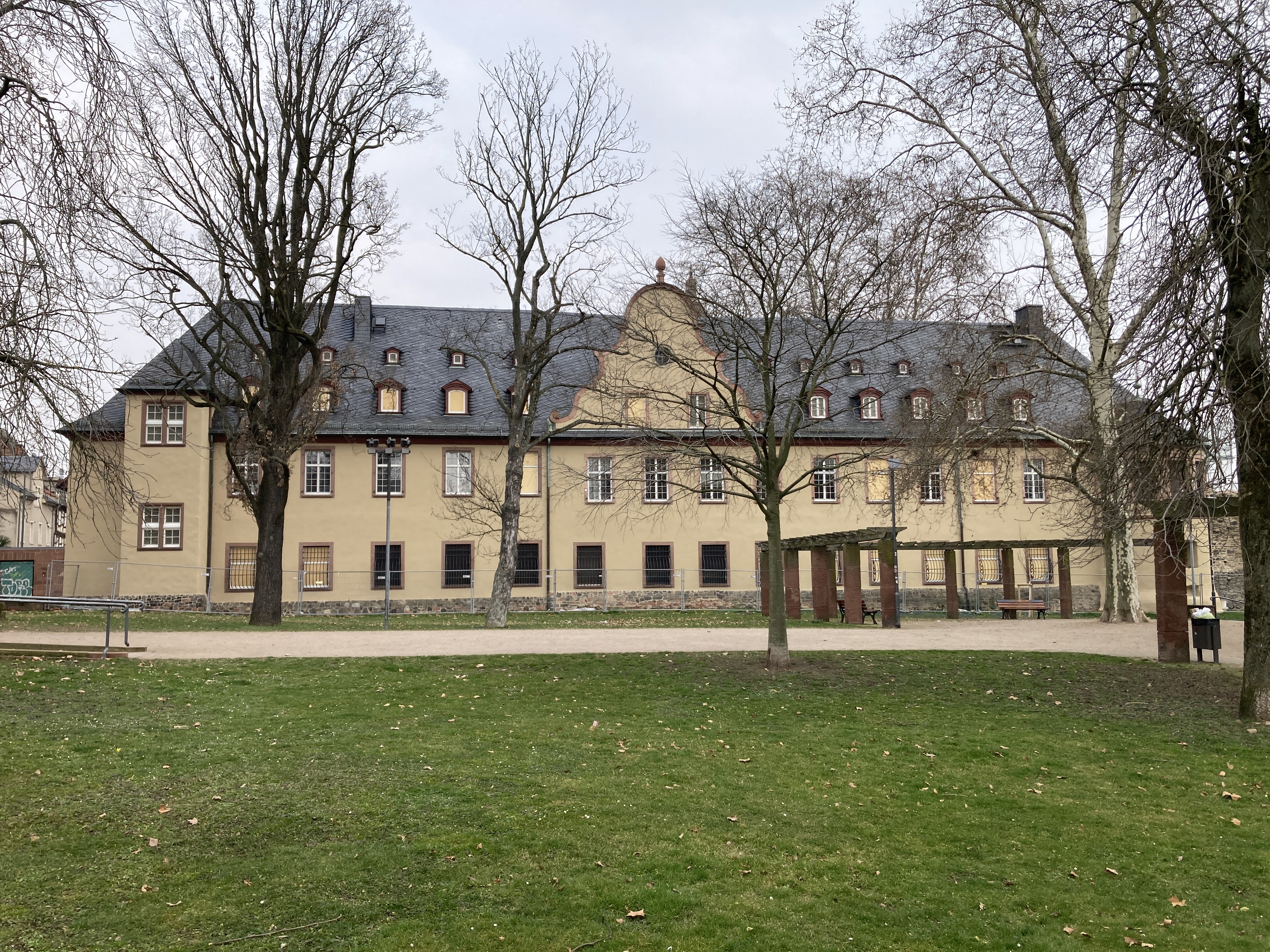 Im 17. Jh. entstand zwischen Burggraben, Stadtmauer und Bolongarostr. das Neue Schloss. Wahrscheinlich aus zwei kleinen Adelssitzen hervorgegangen, gelangte das Ensemble zur Zeit des 30-jährigen Kriegs in den Besitz der Mainzer Kurfürsten. 1784 wurde es verkauft und bis in das 20. Jh. mehrfach veränderten Nutzungen zugeführt, die entsprechende Umbauten nach sich zogen. 2002 übernahm die Deutsche Stiftung Denkmalschutz das Ensemble.