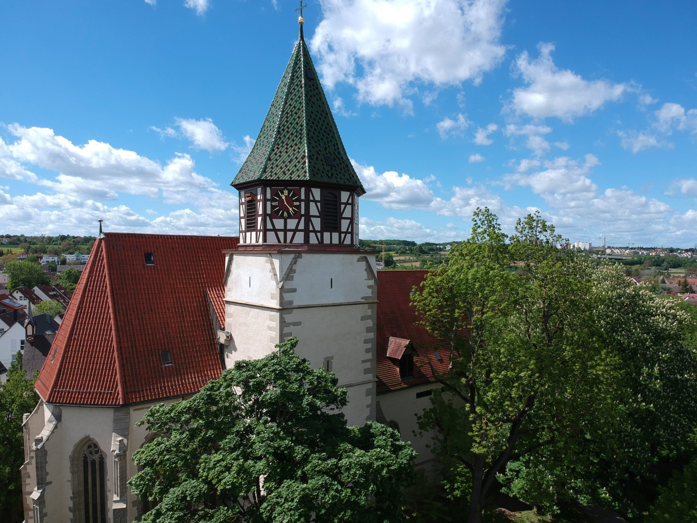 Im spätgotischen Stil 1440–98 erbaut. Älteste Kirche der Kernstadt Ludwigsburg, frühere Wallfahrtskirche. Netzrippengewölbe mit Apostelzyklus, Prophetenhalbfiguren als Gewölbeträger im Schiff, Glasgemälde und herausgearbeitete Figuren. An der Kanzel: Maria mit dem Kinde und die vier wichtigsten Kirchenlehrer des Abendlandes.