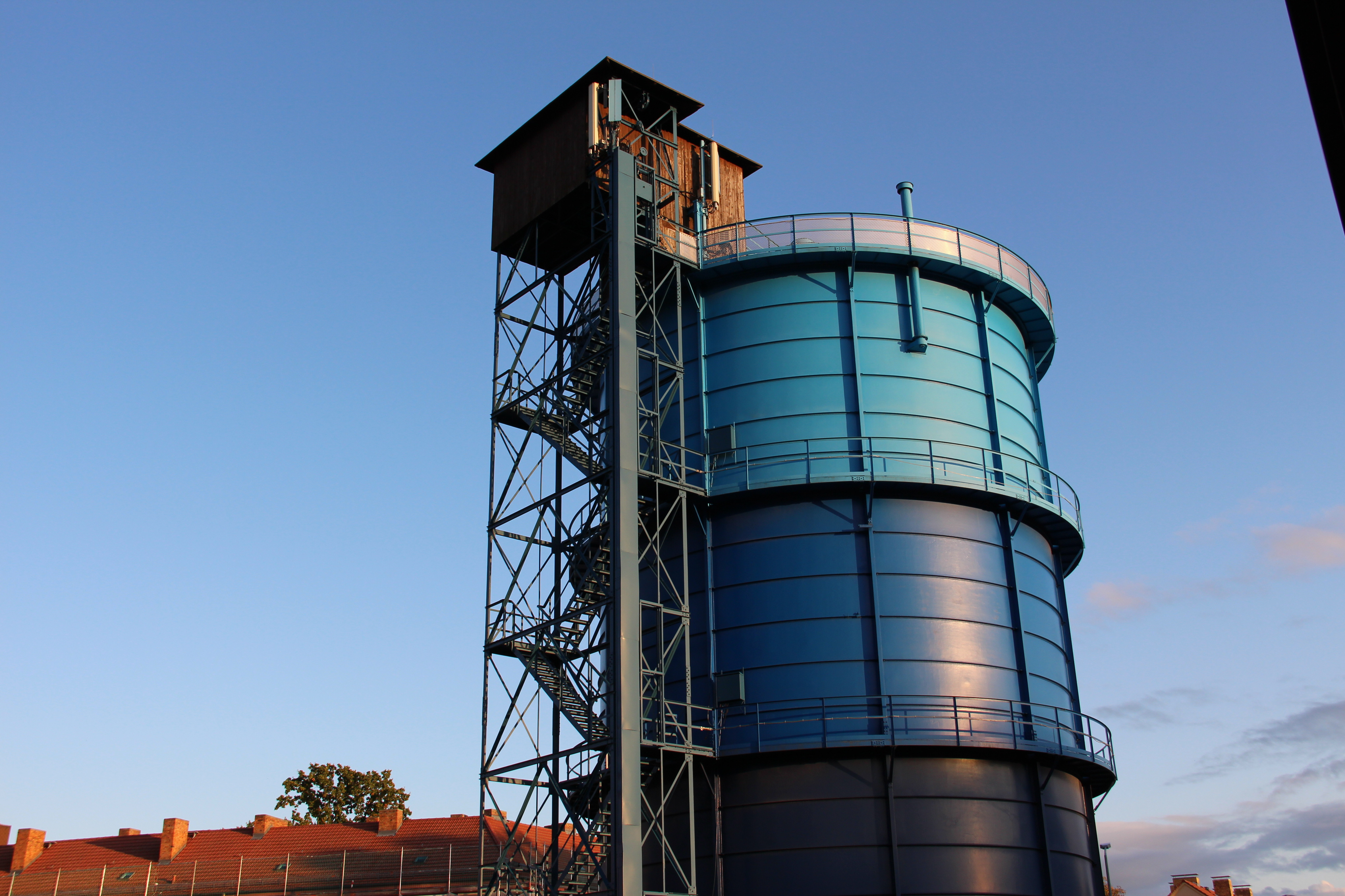 1928/29 als Scheibengasbehälter konstruiert und gebaut, 20 Meter hoher genieteter Stahlkessel, Durchmesser 12 Meter, auf einem Ringfundament aus Beton gelagert, bis 1966 in Funktion.