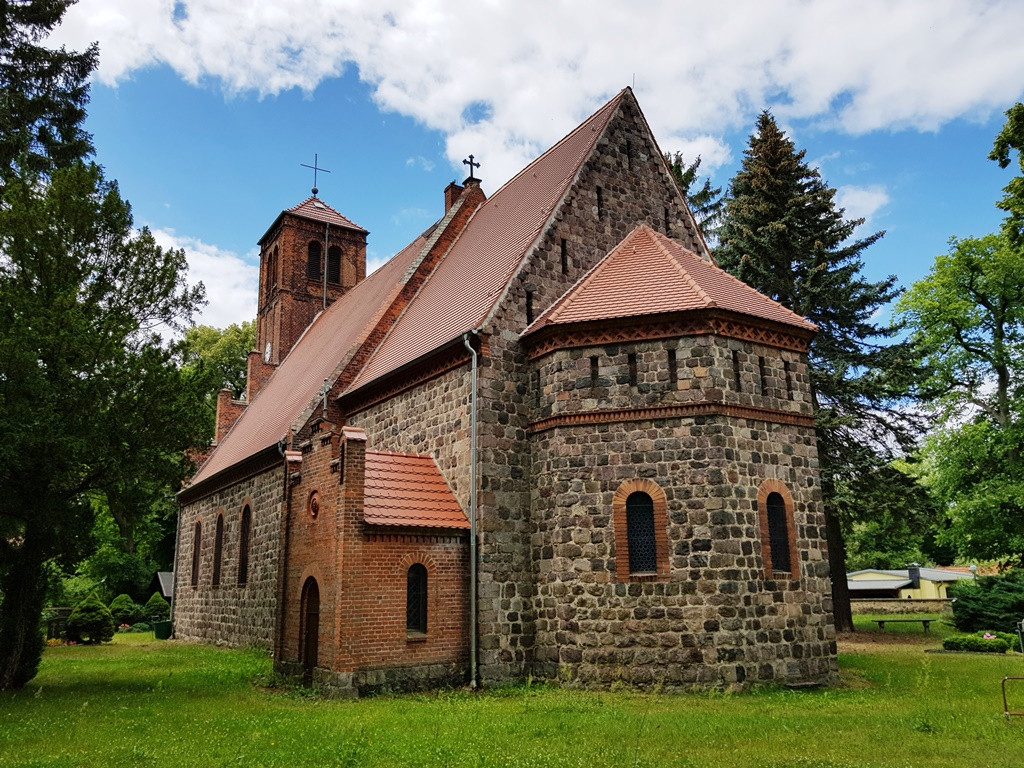 Feldsteinquaderbau aus dem 13. Jh. mit vierfach gestaffeltem Grundriss, Apsis, eingezogenem Chor, Langhaus und Turm. Bei Grundsanierung 1853 wurde der Holzturm durch einen neugotischen Backsteinturm ersetzt. Frühgotisches Spitzbogenportal aus Kalkstein in der Nordwand des Chors.