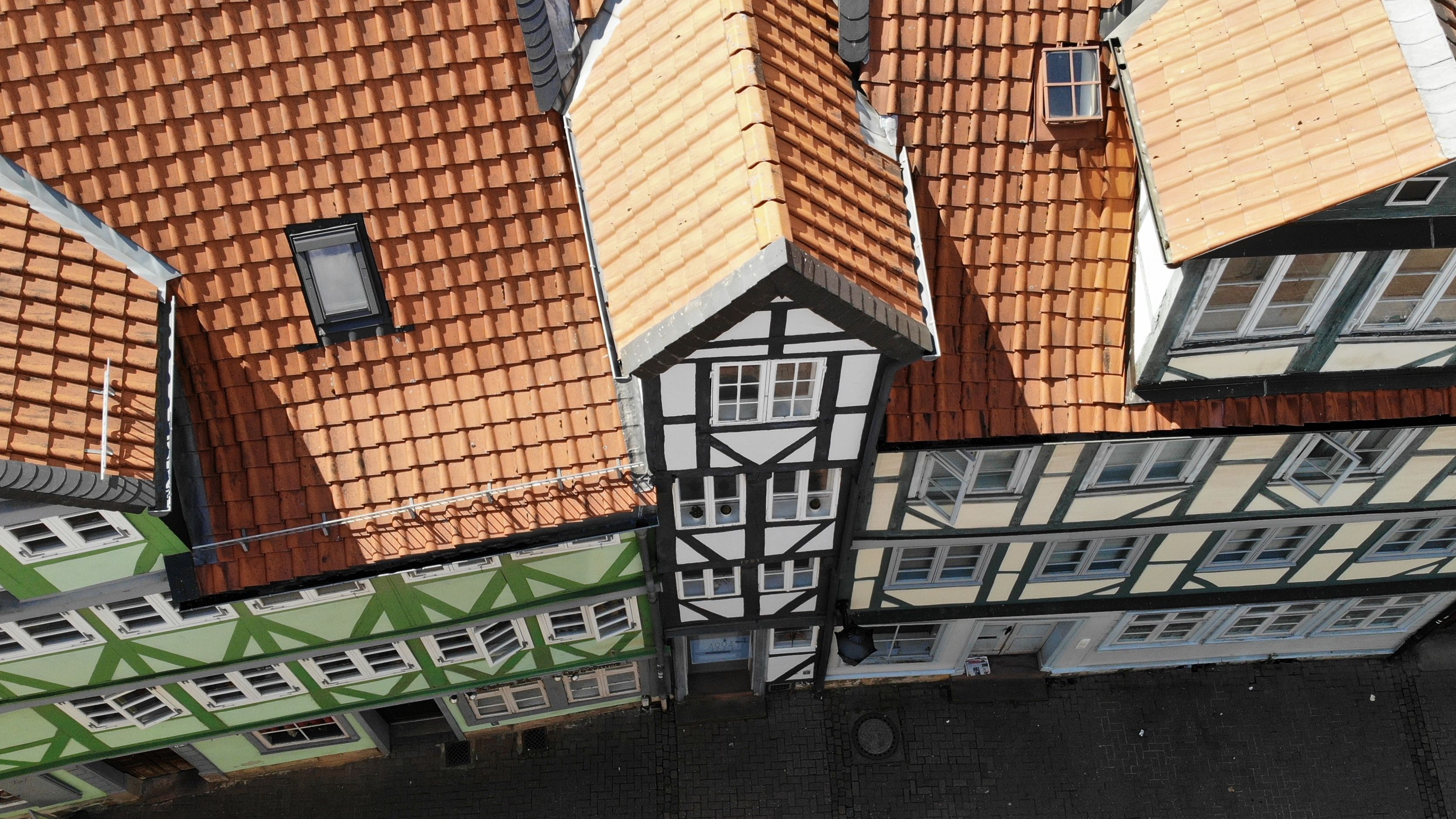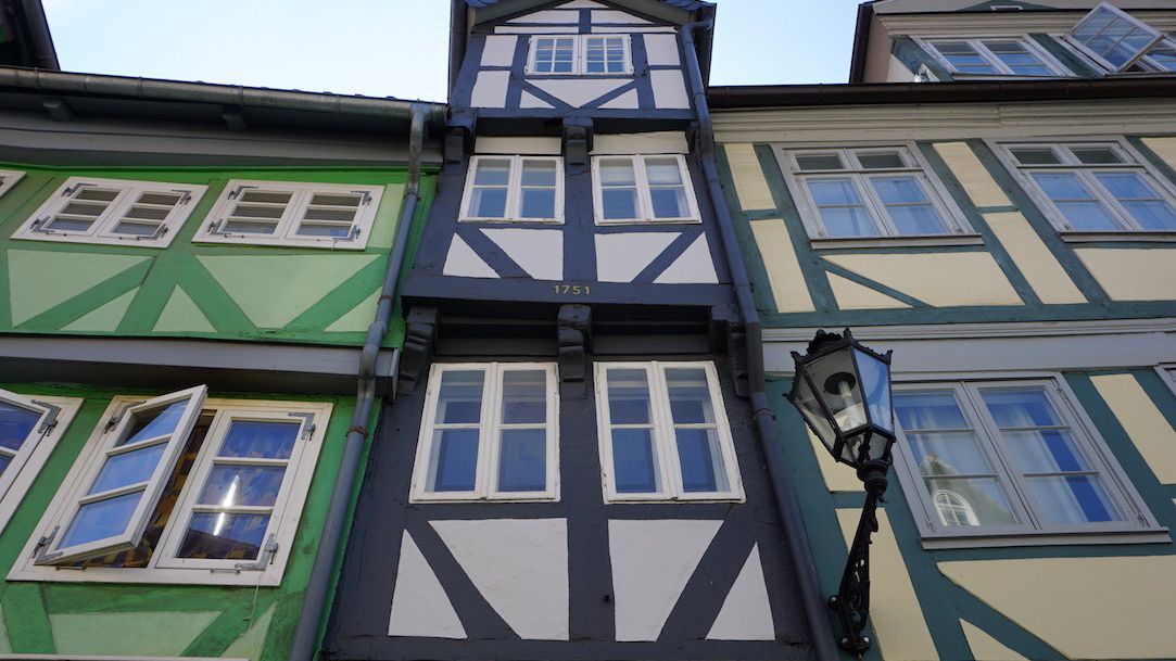 Das schmalste Haus der Stadt wurde im Jahr 1751 in einer ehemaligen Brandgasse errichtet. In dem engen Durchgang wurden Ledereimer mit Löschwasser zu brennenden Fachwerkhäusern eilig hindurch getragen. Die Breite zur Straße beträgt 2,20 m und zur Gartenseite 3,50 m. Dennoch über 100 qm Wohnfläche und im Inneren eine 12 m hohe Stahl-Wendeltreppe, die sich von außen kaum erahnen lässt, sowie 80 qm Garten.