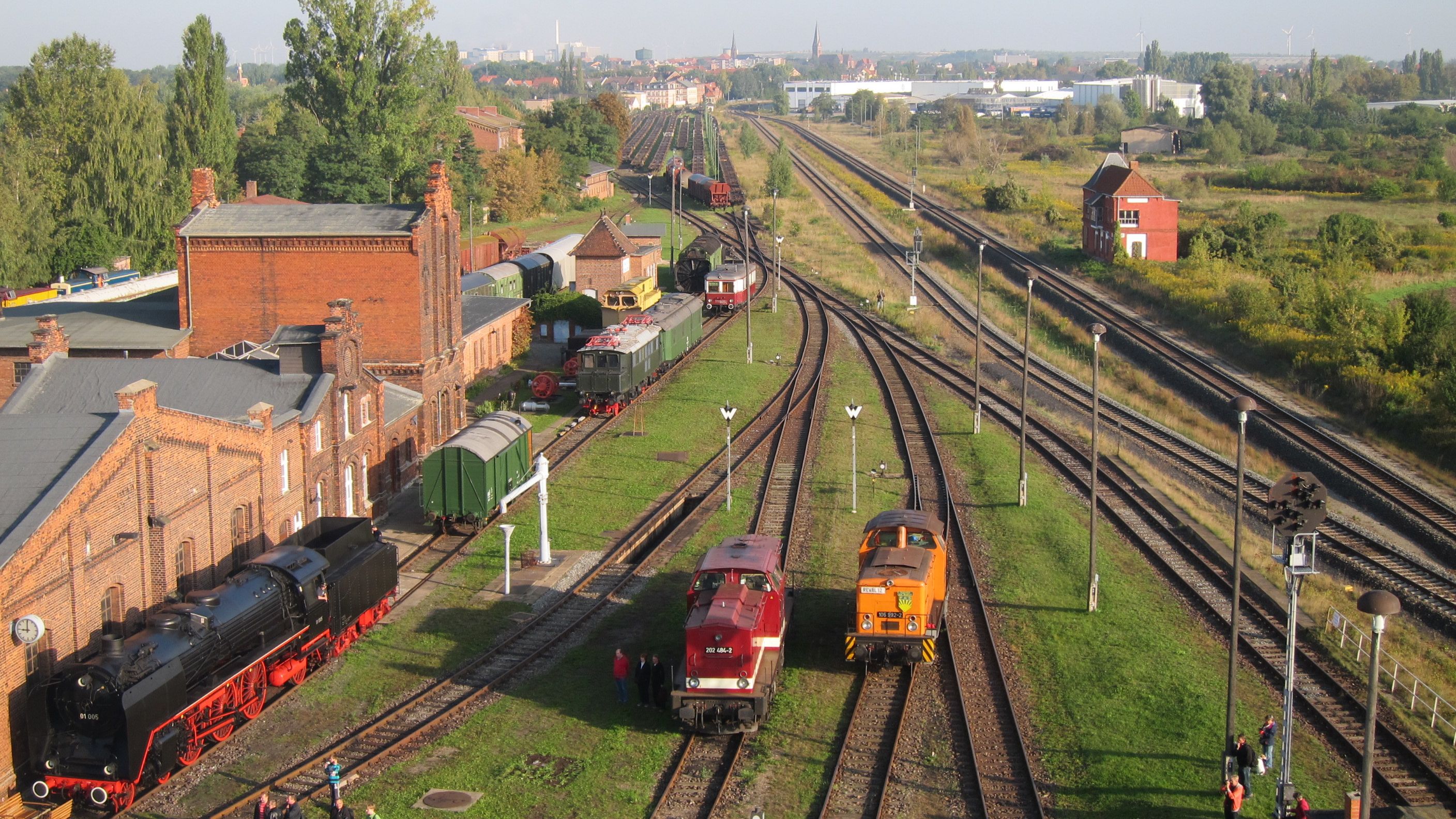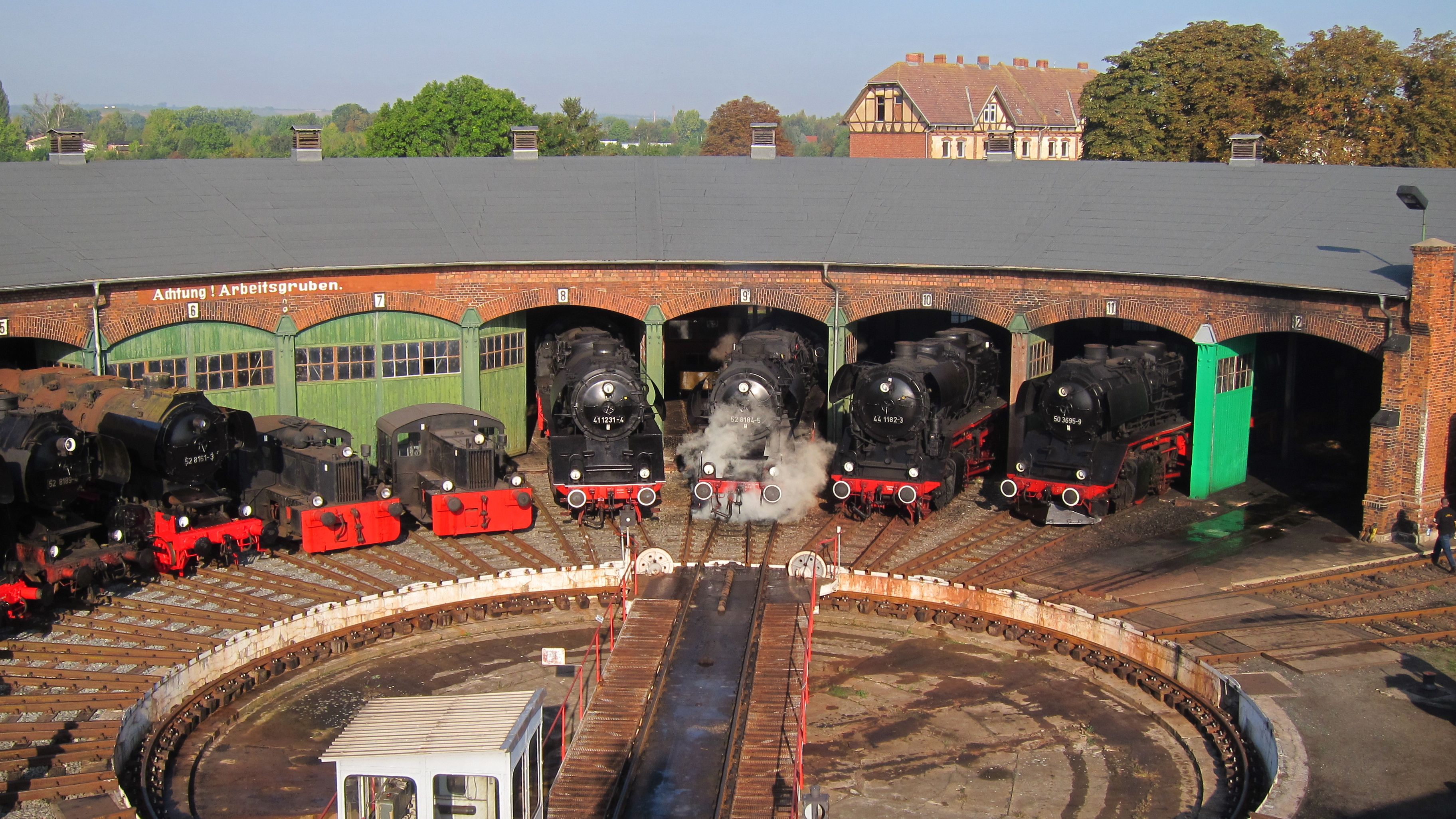 Ringlokschuppen der Bauart Potsdam. Baujahr 1902. Sammlung historischer Eisenbahnfahrzeuge, Werkstätten, Dreherei, Schmiede, Wasserturm und eisenbahngeschichtliche Ausstellung.