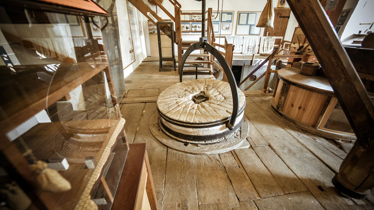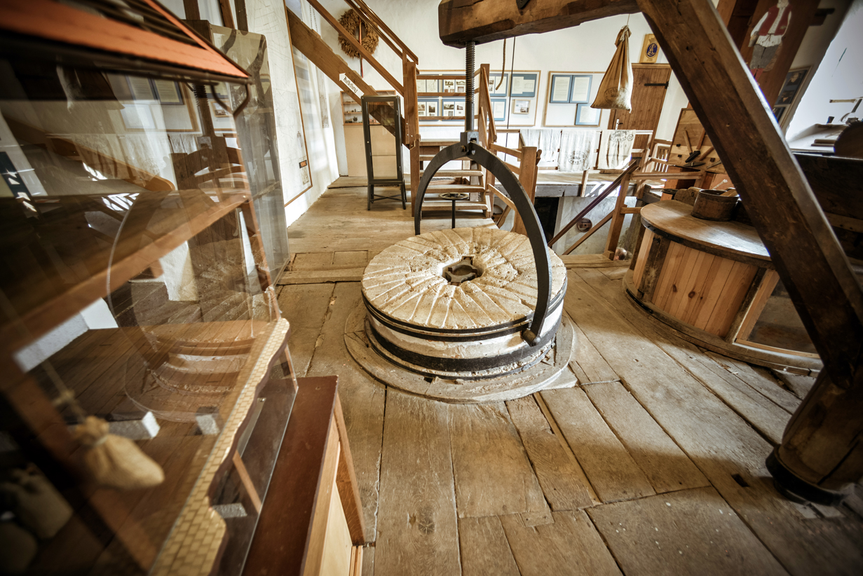 Wassermühle aus dem Jahre 1725, erstmals erwähnt um 1087, mit historischer Mühlentechnik und Dorfmuseum, musealer Außenbereich (Mühleninsel) mit historischen Gebäuden, Bauerngarten und Café.