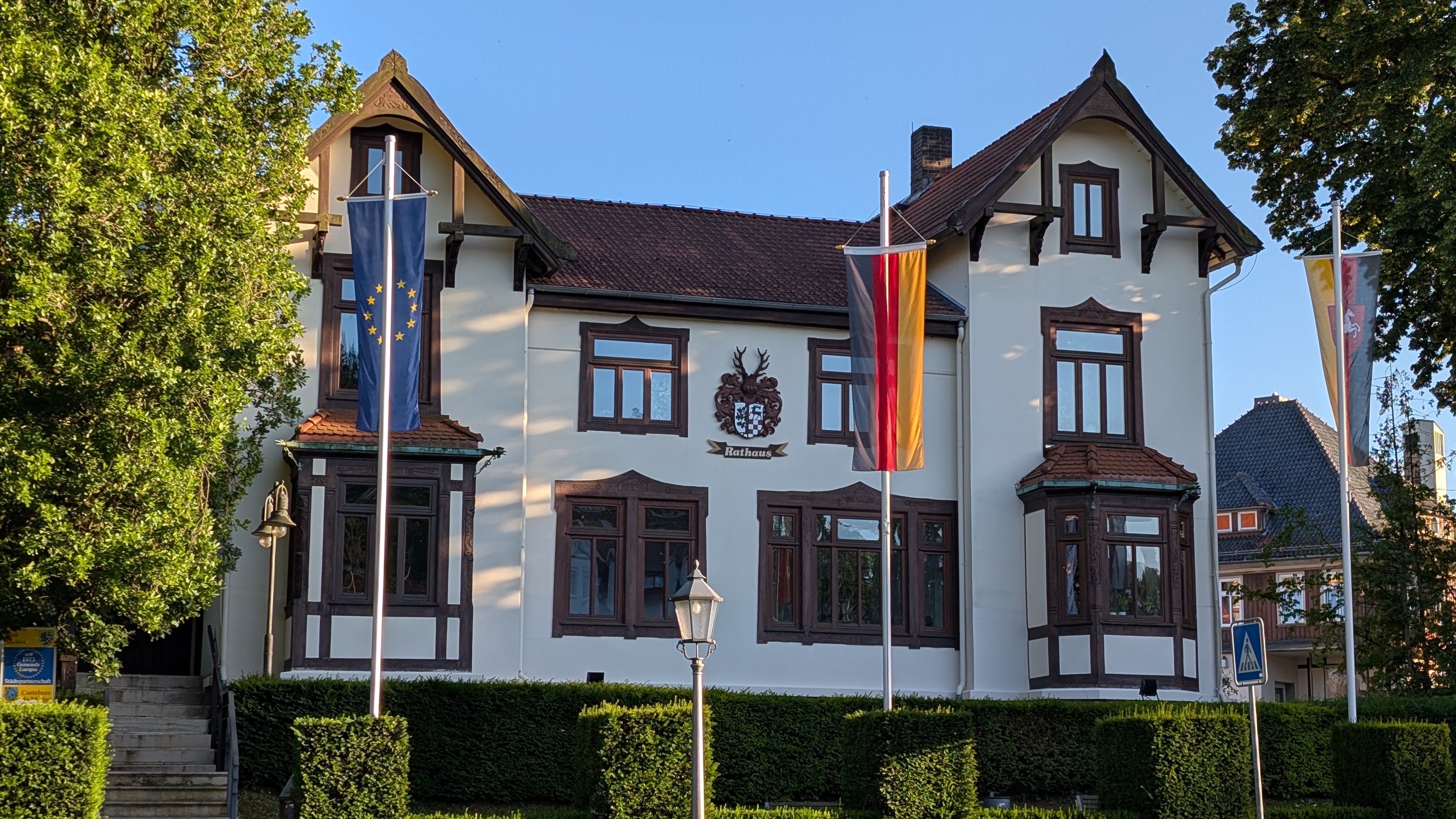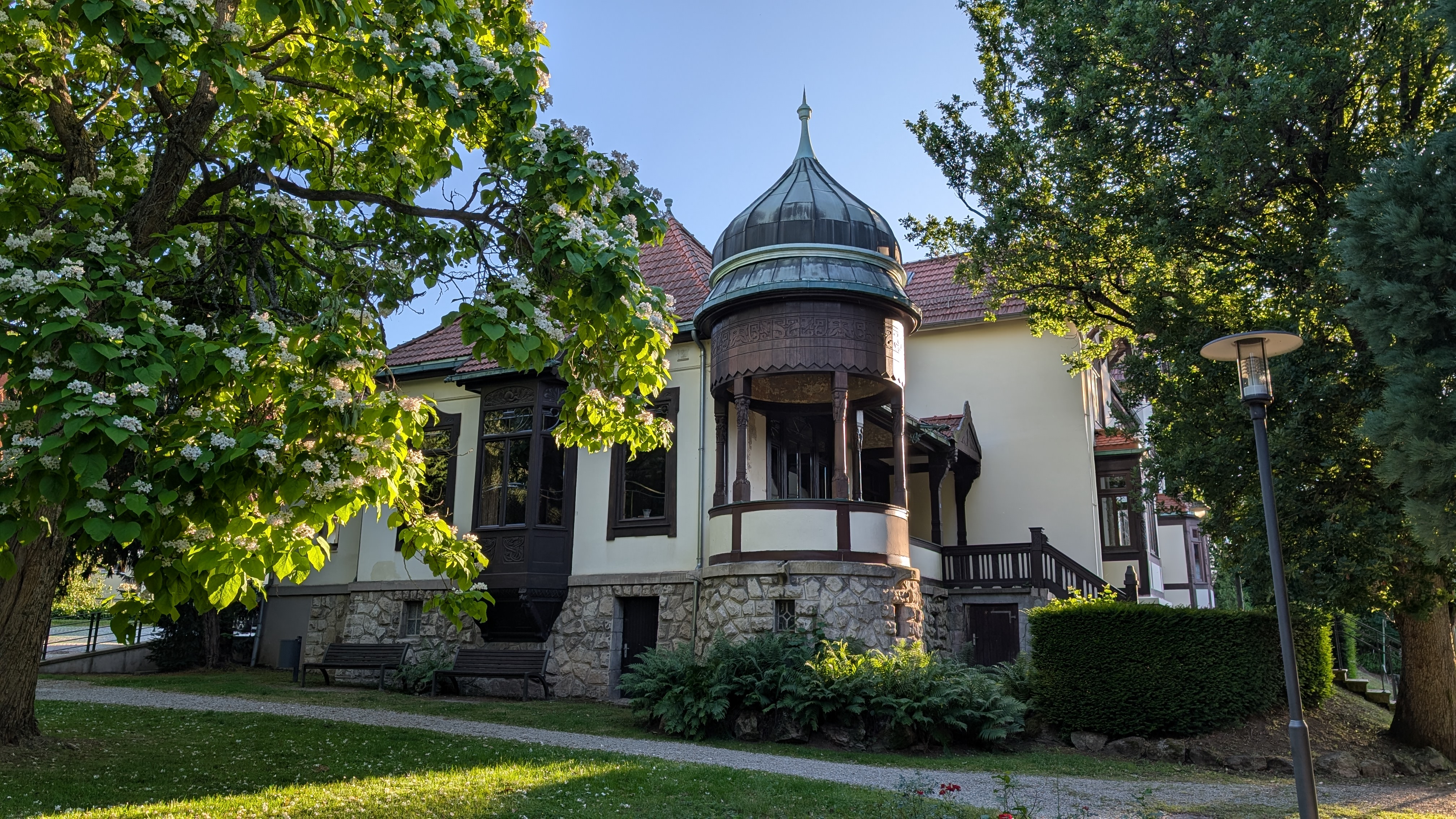 Sitzungssaal im Jugendstil, kunsthandwerklich gestaltete Fenster, Deckenmalerei, Wandverkleidung im Original wiederhergestellt, Intarsien-Arbeiten, holzvertäfelt.