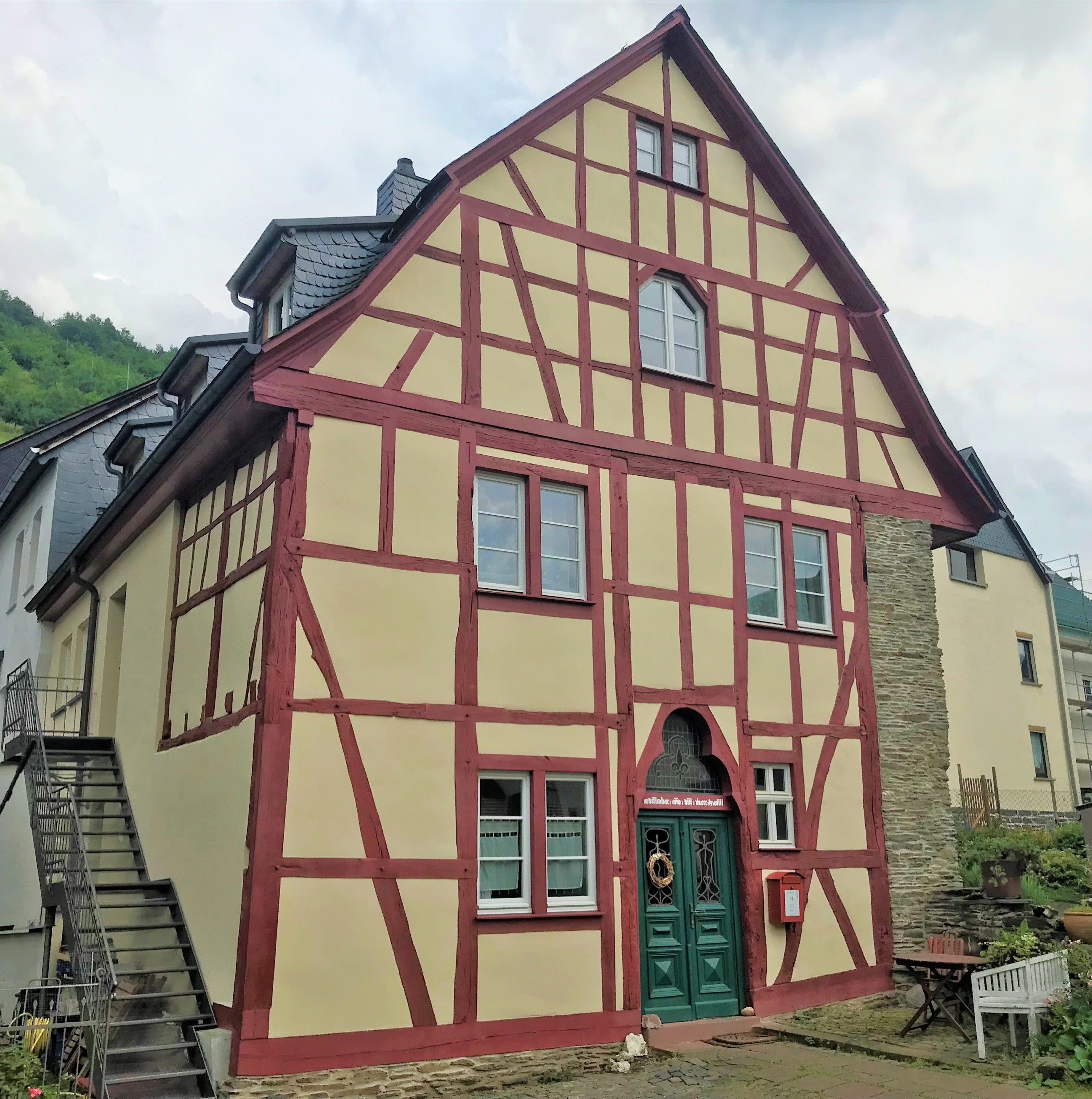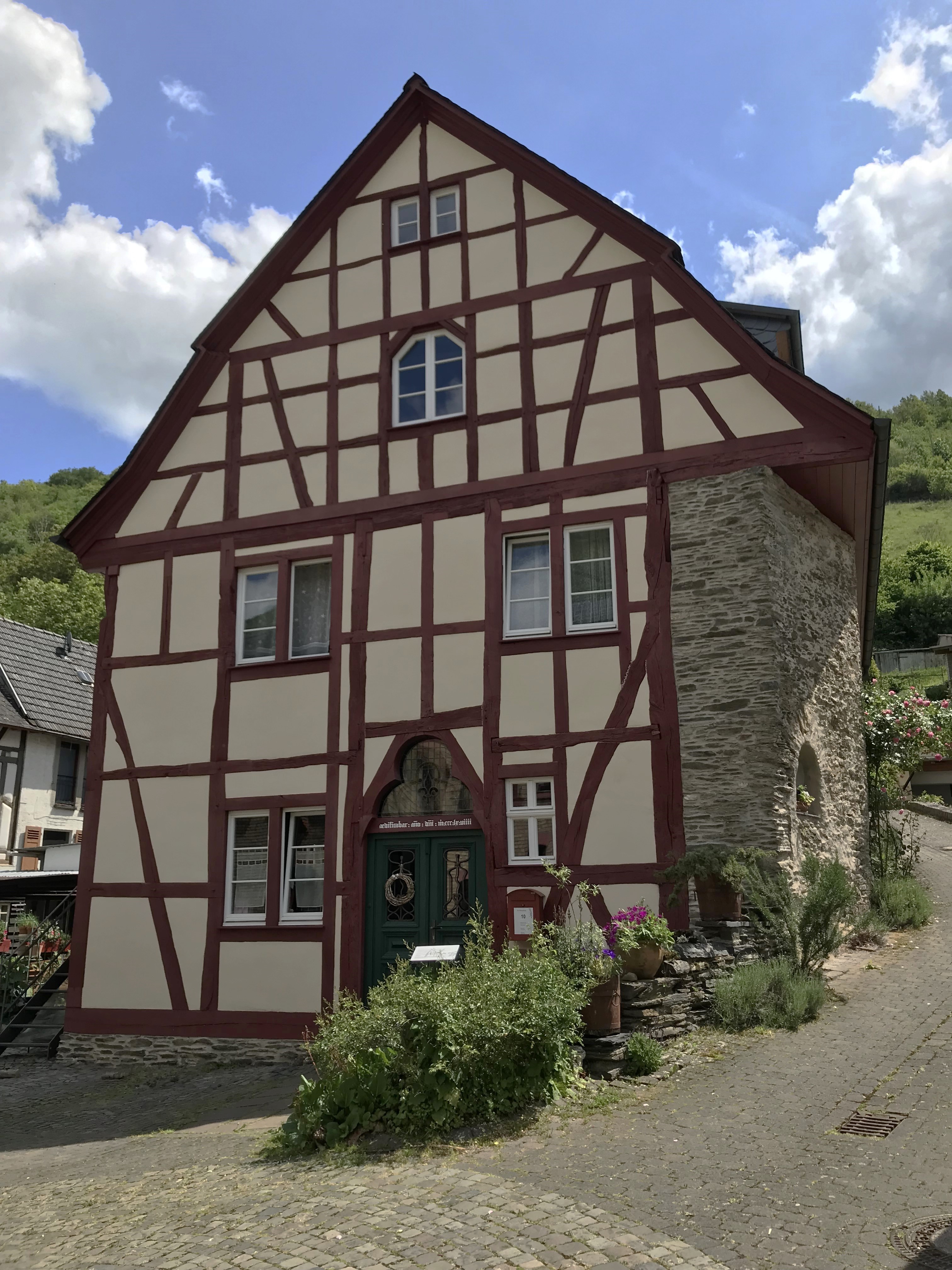 Vermutlich ältestes gotisches Fachwerkhaus am Mittelrhein. Im Kern spätgotisches Wohnhaus in Ständerbauweise von 1368-69 (dendrochronologisch ermittelt) mit Halle, tonnengewölbtem Keller und Brunnenschacht. Traufseitige Bruchsteinmauer wahrscheinlich älter. Fachwerk der Giebelseite mit Maßwerkportal. Fenster und Portal unterstreichen die repräsentative, möglicherweise herrschaftliche Bedeutung des Gebäudes, das von außerordentlichem Belang für die Hausforschung ist. 1979 vor dem Abriss bewahrt.