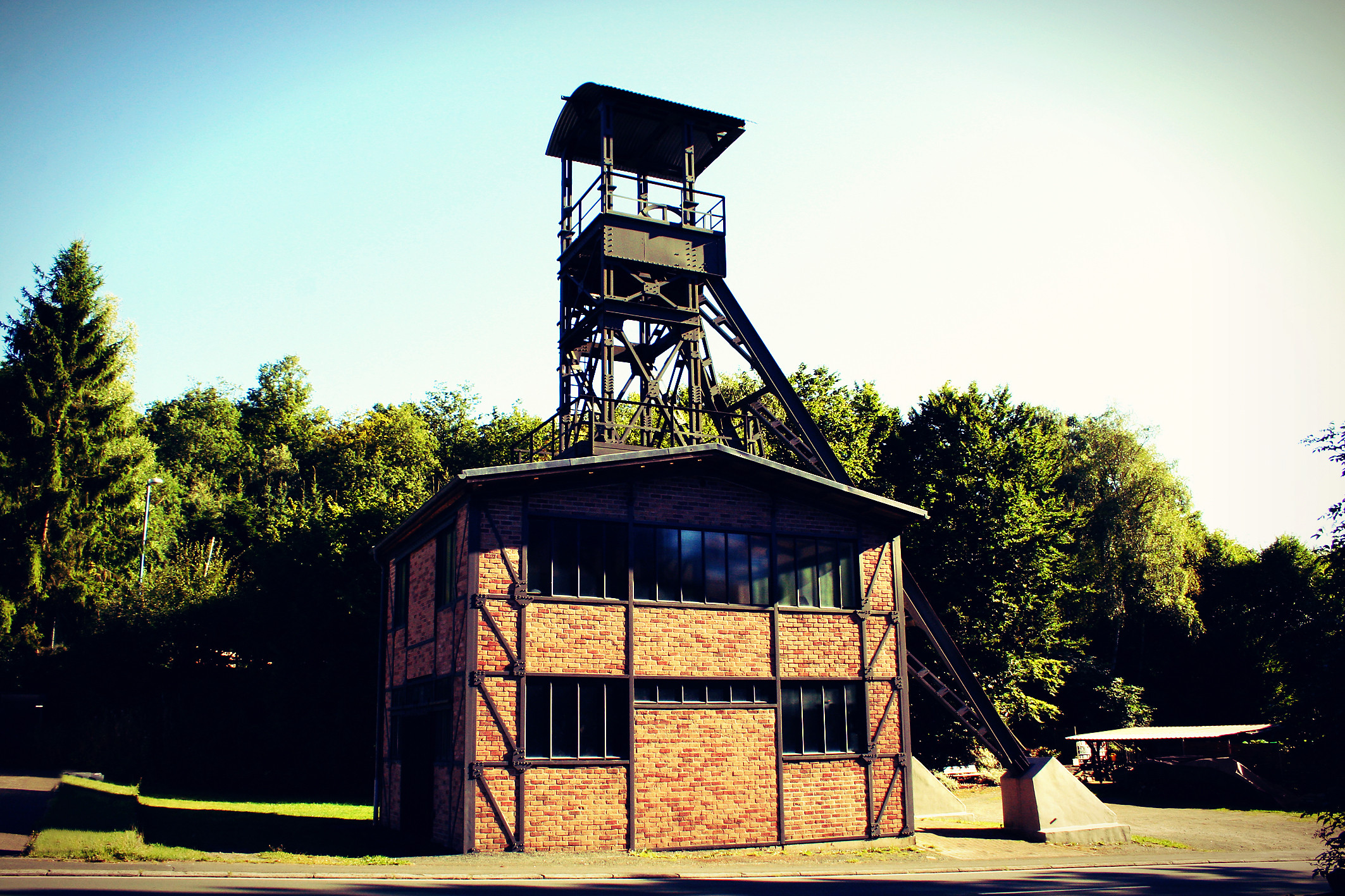 Für das Siegerland typischer 16 m hoher Förderturm mit Schachtgebäude, der 1995 auf dem Gelände der ehemaligen Grube Grimberg wiederaufgebaut wurde. 1807-1911 in Betrieb.