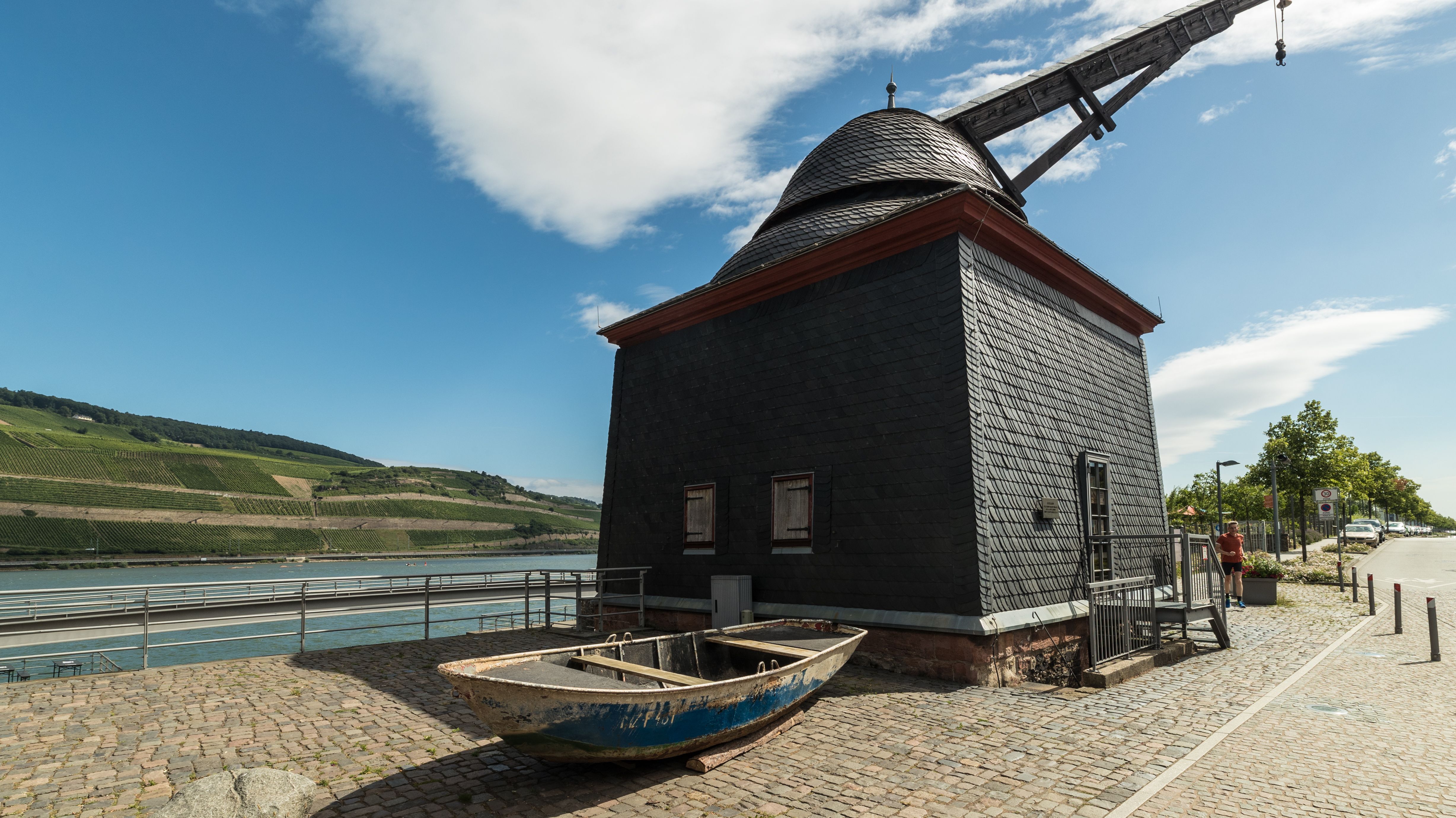 Der Binger Kran am Rheinufer war ein halbes Jahrtausend in Betrieb: 1487 wurde er erbaut und ist damit der älteste datierbare Landkran zwischen Mainz und Köln am Rhein. Er war eine wichtige Einnahmequelle für die Binger Landesherren, das Mainzer Domkapitel. Angetrieben wird der Kran mit Menschenkraft über zwei große Laufräder. In erster Linie wurden hier Wein, Salz und Getreide verladen. Für die beiden Letzteren hatte Bingen Stapelrechte.