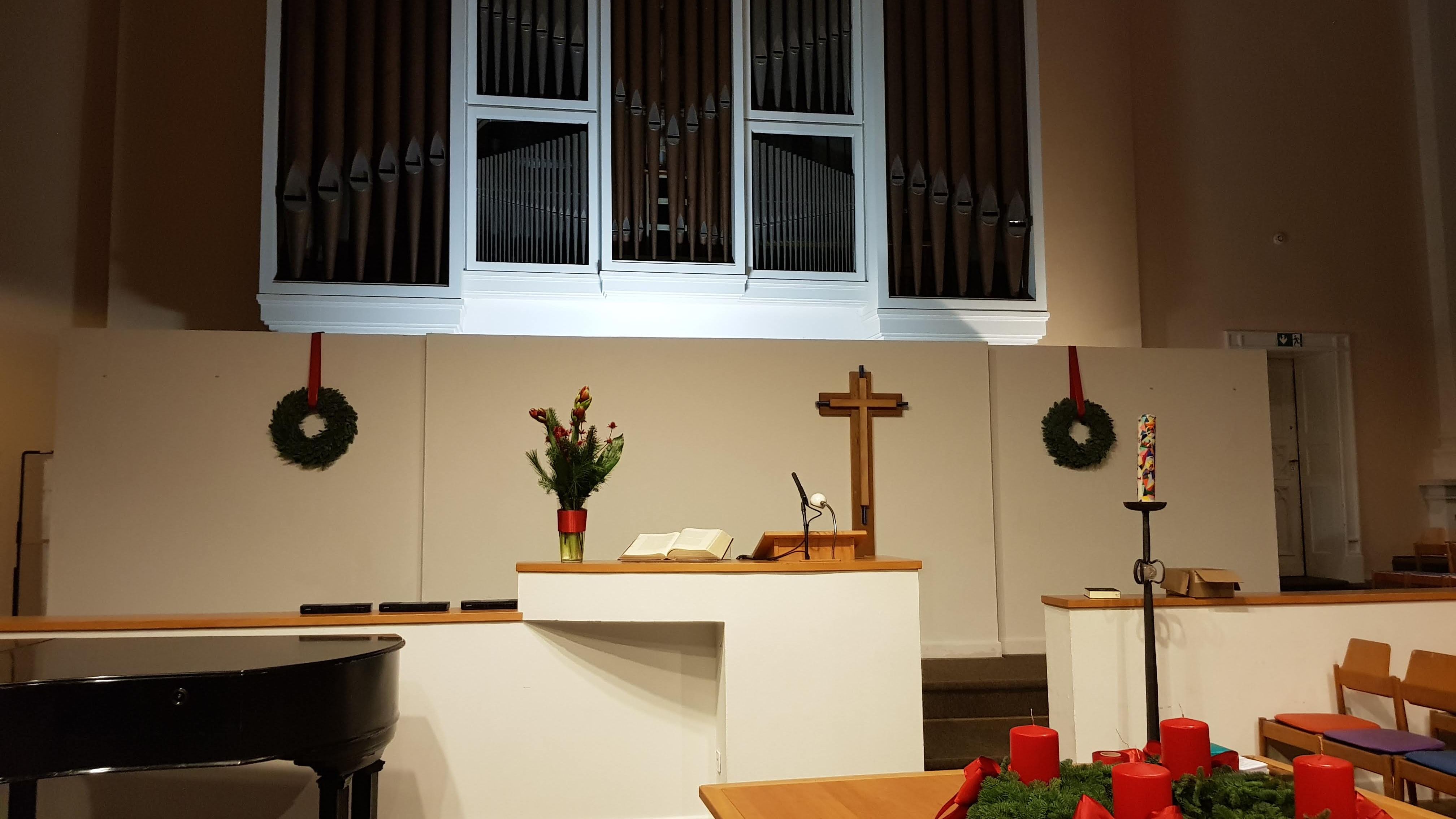 Nach dem schönen Eingang durch die rote Tür gibt es eine Treppe, die direkt in den Gottesdienst- und somit in den Veranstaltungsraum führt. Keine Hemmungen – oben angekommen, gibt es viel zu entdecken. Wir heißen alle Gäste herzlich willkommen, auch die Kleinen, auf die ein
