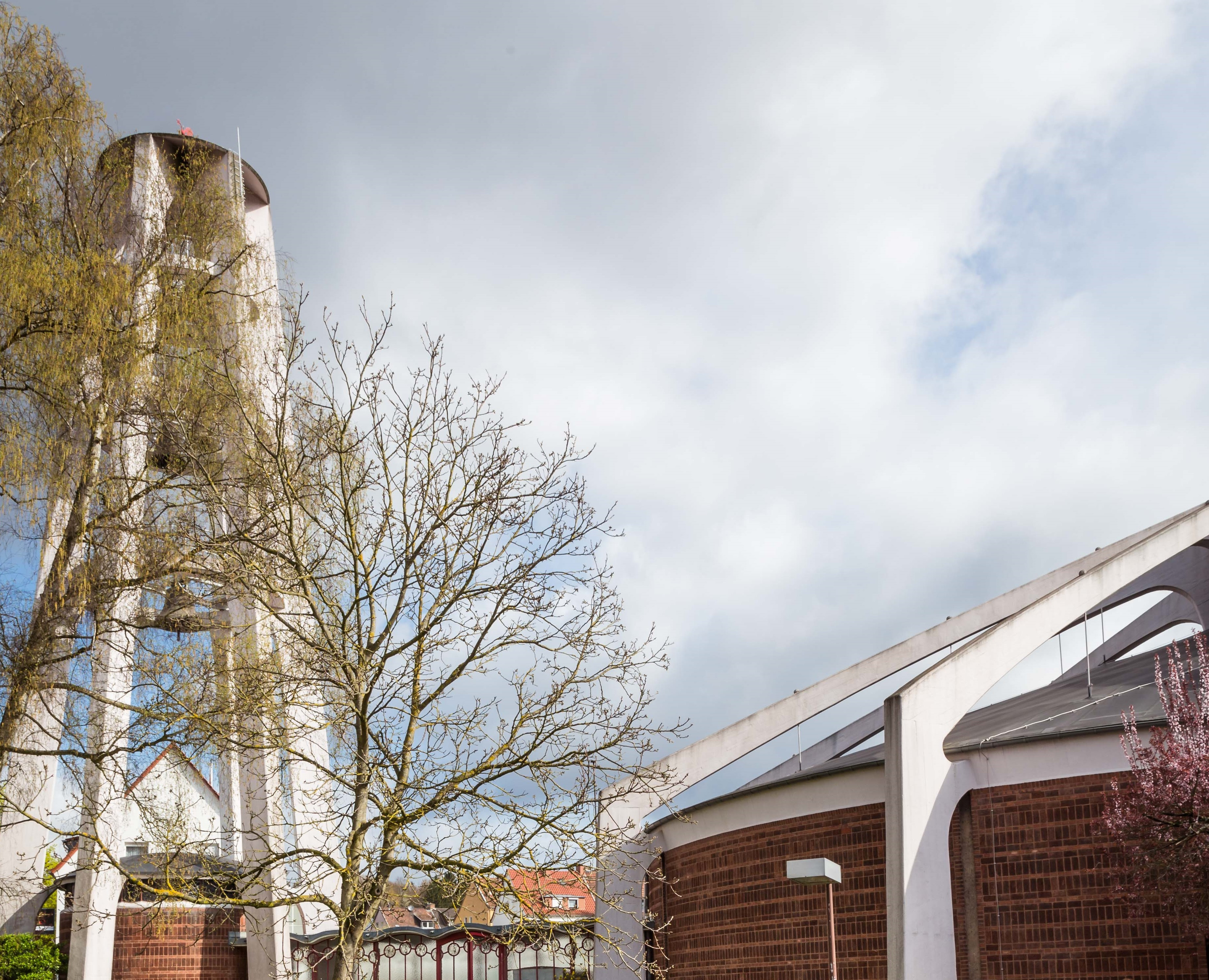 Die Kirche wurde 1950-54 nach den Plänen von Gottfried Böhm errichtet. Der freistehende Kirchenraum mit elliptischem Gemeinderaum und kreisrundem Altarraum mit Tambourkuppel wird von außenliegenden Betonstrebebögen umfangen, die ihre Entsprechung im Tragewerk des abgerückten Glockenturms finden. Die Kirche St. Albert gehört zur Straße der Moderne.