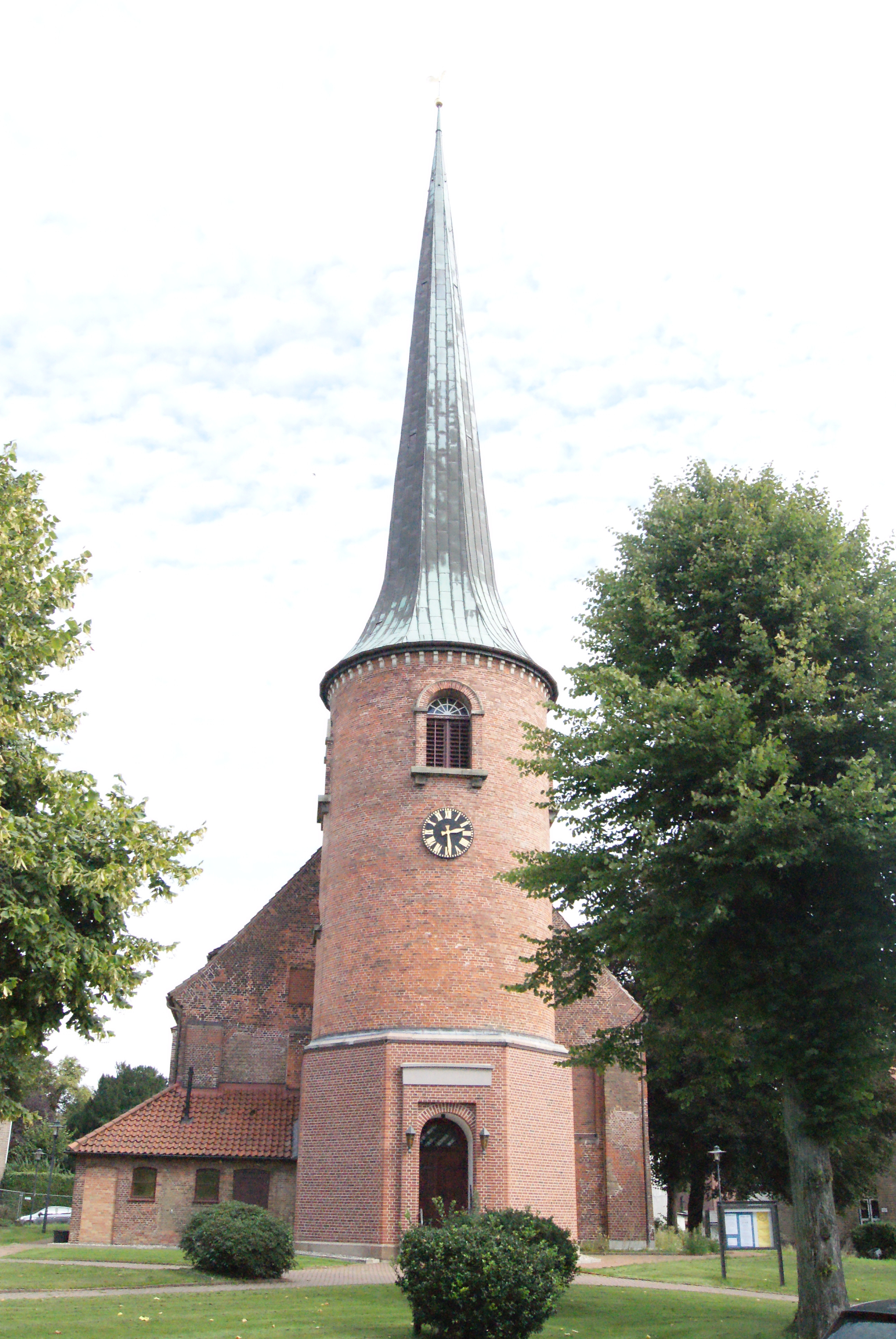 Barocke Saalkirche von 1718 mit reicher Innenausstattung aus dem 18. Jh. mit Altar, Kanzel, Taufe, Grafenstuhl, Orgel und hölzernem Tonnengewölbe. Der inzwischen neu ummantelte Turm geht auf einen Vorgängerbau aus dem 12. Jahrhundert zurück. Die Kirche wurde auf Veranlassung von Graf Wilhelm Adolf Rantzau nach Plänen von Johann Lorenz Neger erbaut. Das Deckengemälde von 1754-56 von Morthorst zeigt biblische Szenen. Restaurierungsarbeiten von 2012-2016.