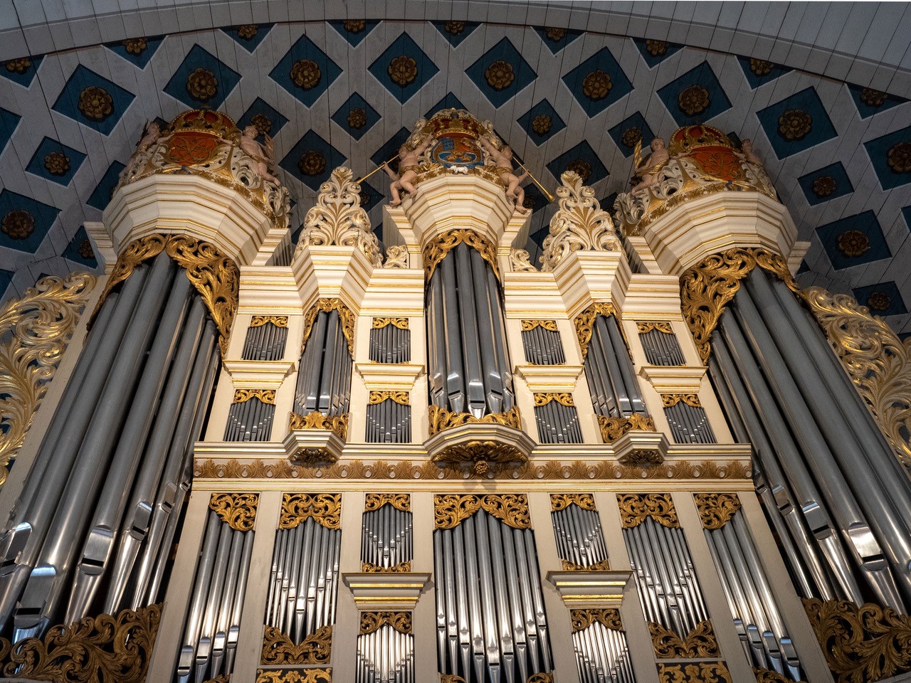 Errichtet 1695-1700 im Zuge der Bebauung des Neuwerks durch Christian V. von Dänemark. Königsstuhl, eine geschlossene Loge für die königliche Familie. Arp Schnitger-Orgel von 1716.