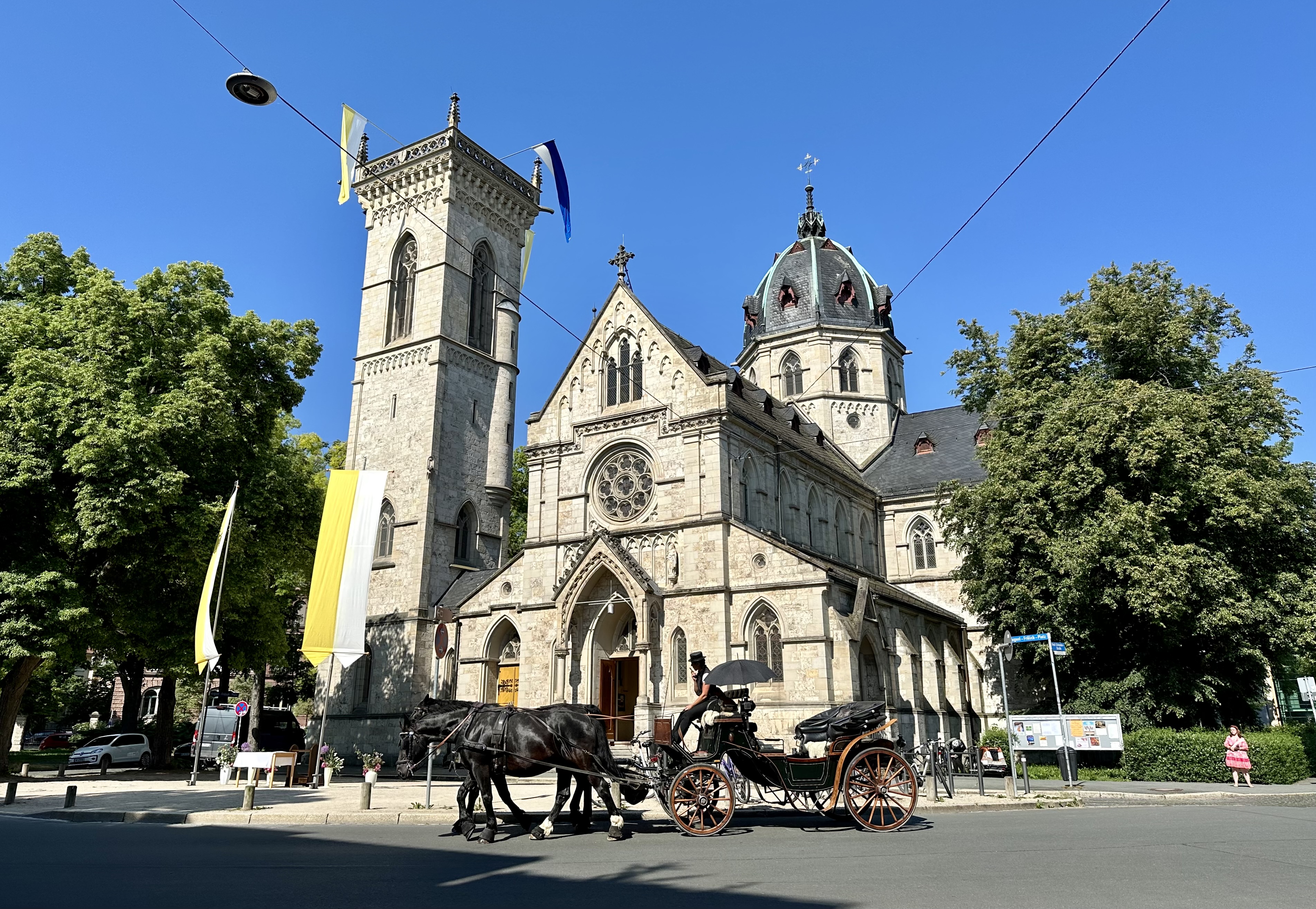 Der Bau der neogotischen Pfarreikirche Herz Jesu wurde 1889 begonnen. Zuvor waren dafür eine Genehmigung von Großherzog Carl Alexander und der Landesregierung im protestantischen Weimar sowie eine europaweite Spendenaktion nötig. Diese begann 1863 und wurde u. a. von Franz Liszt und Johann Nepomuk Hummel prominent unterstützt. Architekt Max Meckel plante eine neogotische Kirche im Stil der italienischen Renaissance. Vorbild für Kuppel und Glockenturm war der Dom von Florenz. Kirchweihe war 1891.
