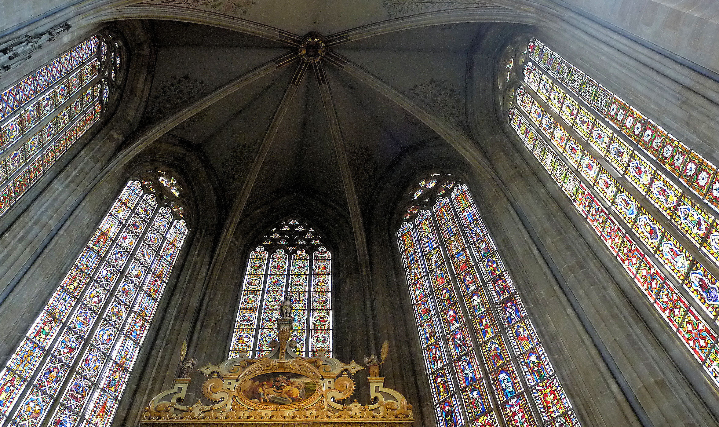 Wertvolle, farbige Glasfenster und umfangreiche Bildkompositionen erinnern im Chor der Stadtkirche an Zeugen der Vergangenheit. Sie sind durch das Licht von außen ein zeitloser Erfahrungsschatz des Glaubens in der Gegenwart.