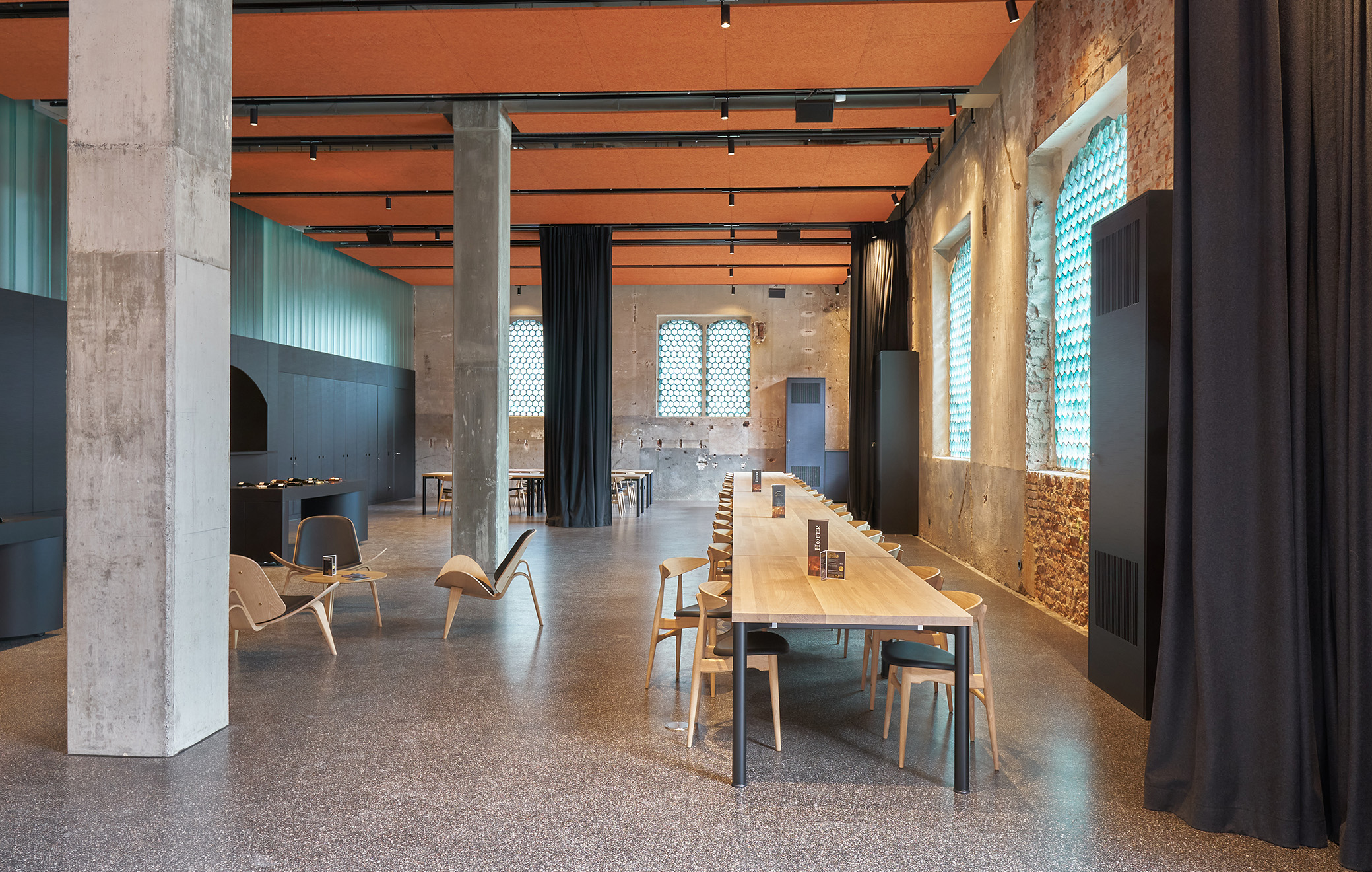 Das Eismaschinenhaus, Industriedenkmal von 1887, ist das Herzstück des ehemaligen Brauereigeländes Würzburger Bürgerbräu. Aufgabe war die denkmalgerechte Aktivierung der Sektkellerei für öffentliche Nutzung. Entwurfsbestimmend war der komplette Erhalt im vorgefundenen Zustand ohne Beseitigung der Alterungspatina. Notwendige Einbauten sind als reversibles Haus-in-Haus-Konzept ausgeführt. Im Obergeschoss wurde die eiserne, filigrane Dachkonstruktion und die Eisenlamellenfassade erhalten.