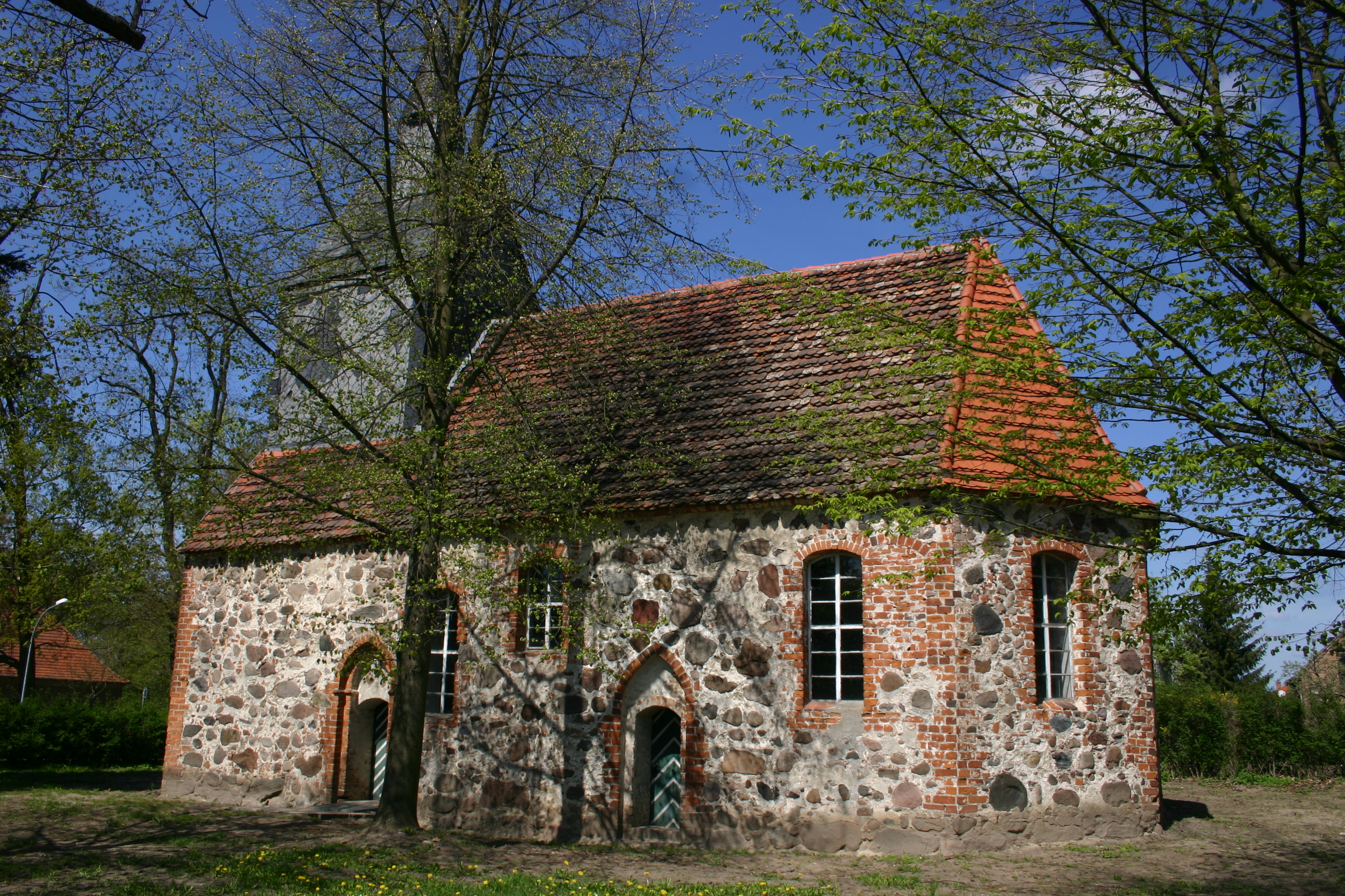 Spätgotischer Saalbau, Kirchhof mit Grabstein des Rittmeisters Gregor von Woldeck. Baubeginn 1473, Vollendung 1509, Glockenturm 1516 fertiggestellt.