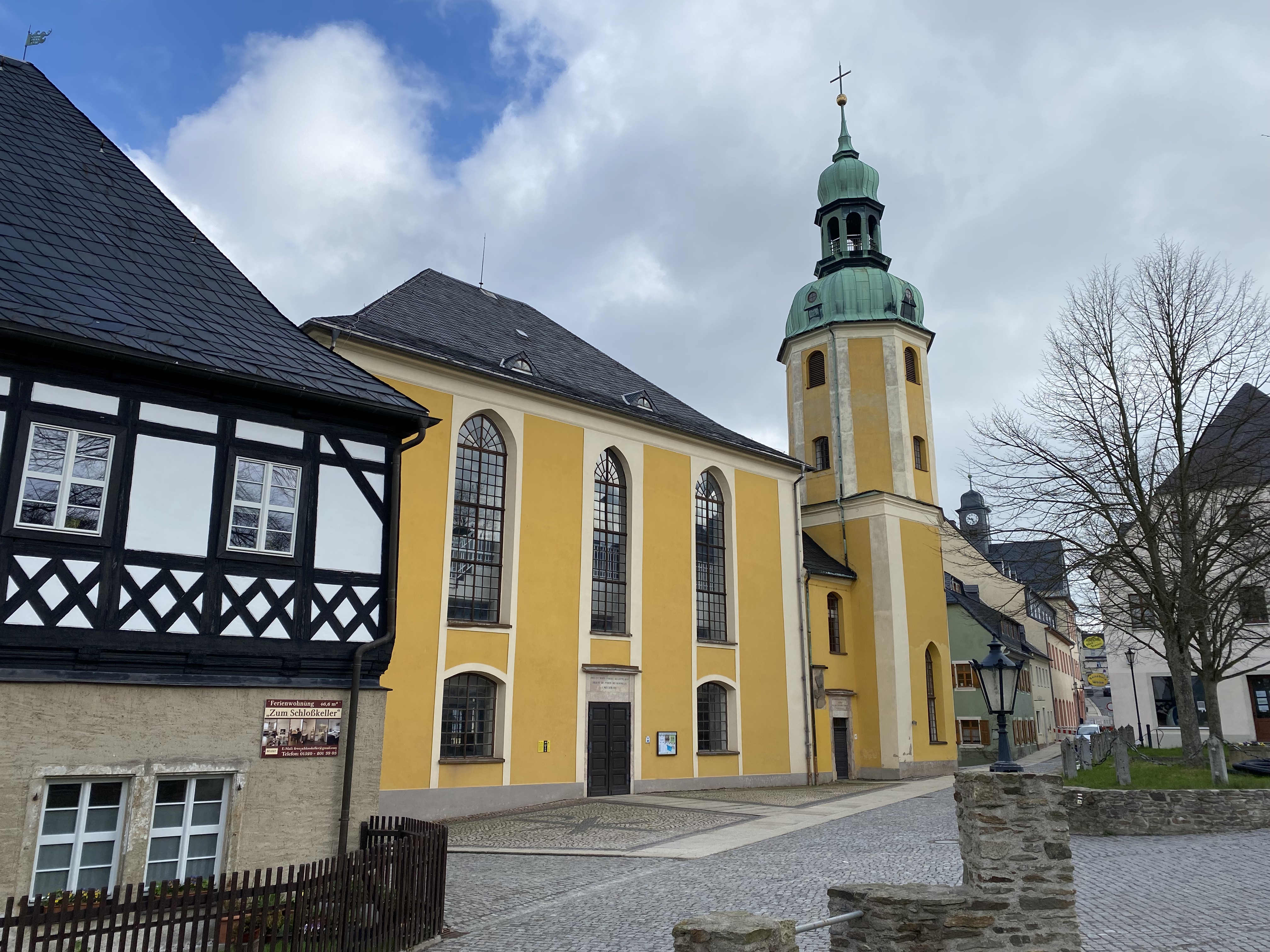 Die ev.-luth. Kirche geht auf einen spätmittelalterlichen Vorgängerbau zurück und befindet sich in unmittelbarer Nähe zur Burg Wolkenstein. Sie wurde in ihrer heutigen Gestalt nach dem Stadtbrand von 1687 im Stil des sächsischen Spätbarock errichtet. Der 1648 erbaute Chorraum im Osten ist als ältester Teil vom Vorgängerbau erhalten geblieben. Das rechteckige Kirchenschiff wurde 1689, der 35 m hohe Turm 1710 vollendet. Der Innenraum der Kirche ist klassizistisch.