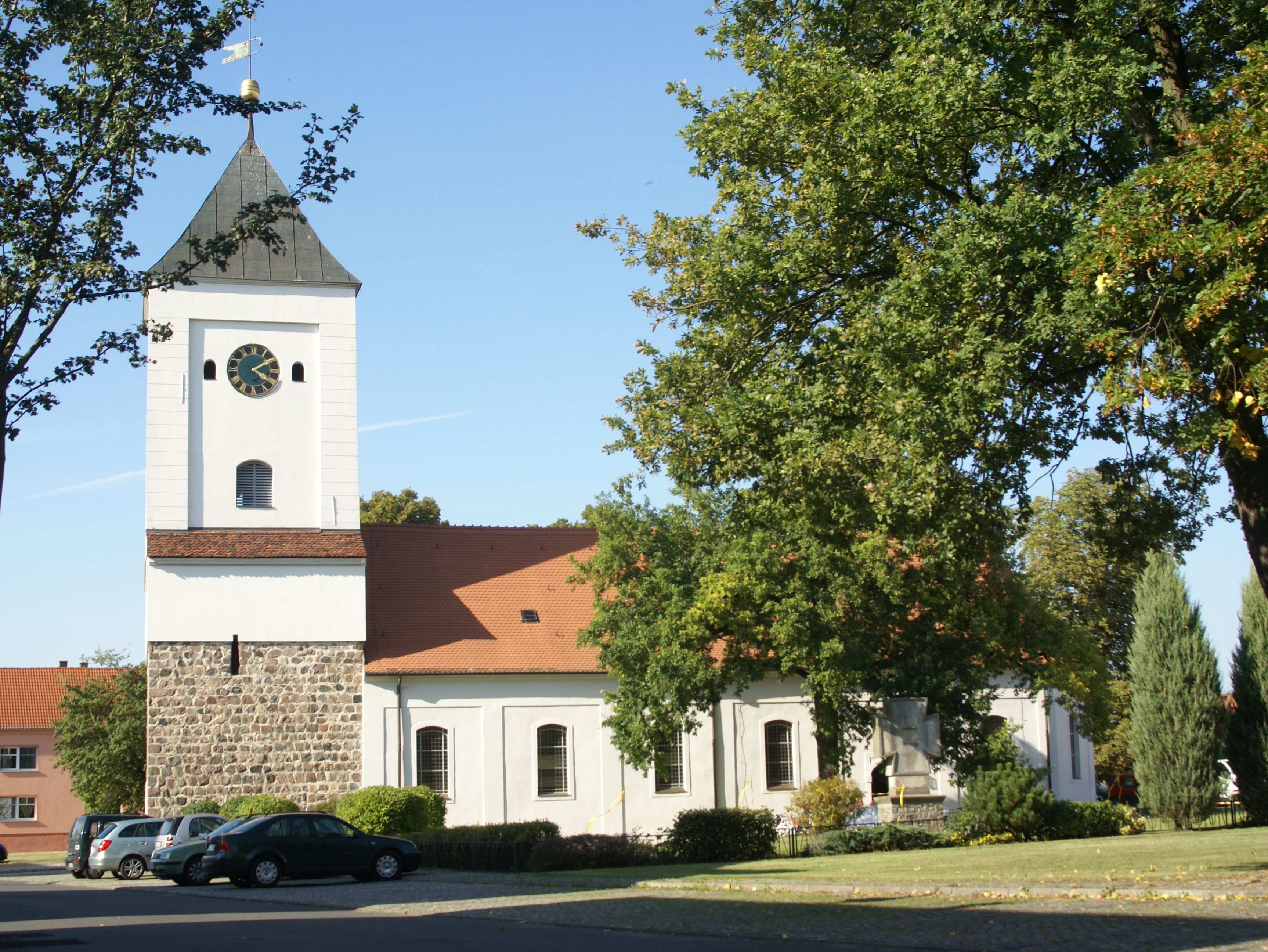 Mit mittelalterlichem Feldsteinturm und Wehrturm. Umfassender Umbau 1734-45, Innenraum mit Hufeisenempore und hölzernem Kanzelaltar. Lebensgroße Figuren der Apostel Petrus und Paulus. In der Turmhalle befindet sich eine geschnitzte Pietà. Umfangreiche Renovierungsarbeiten 2003-09.