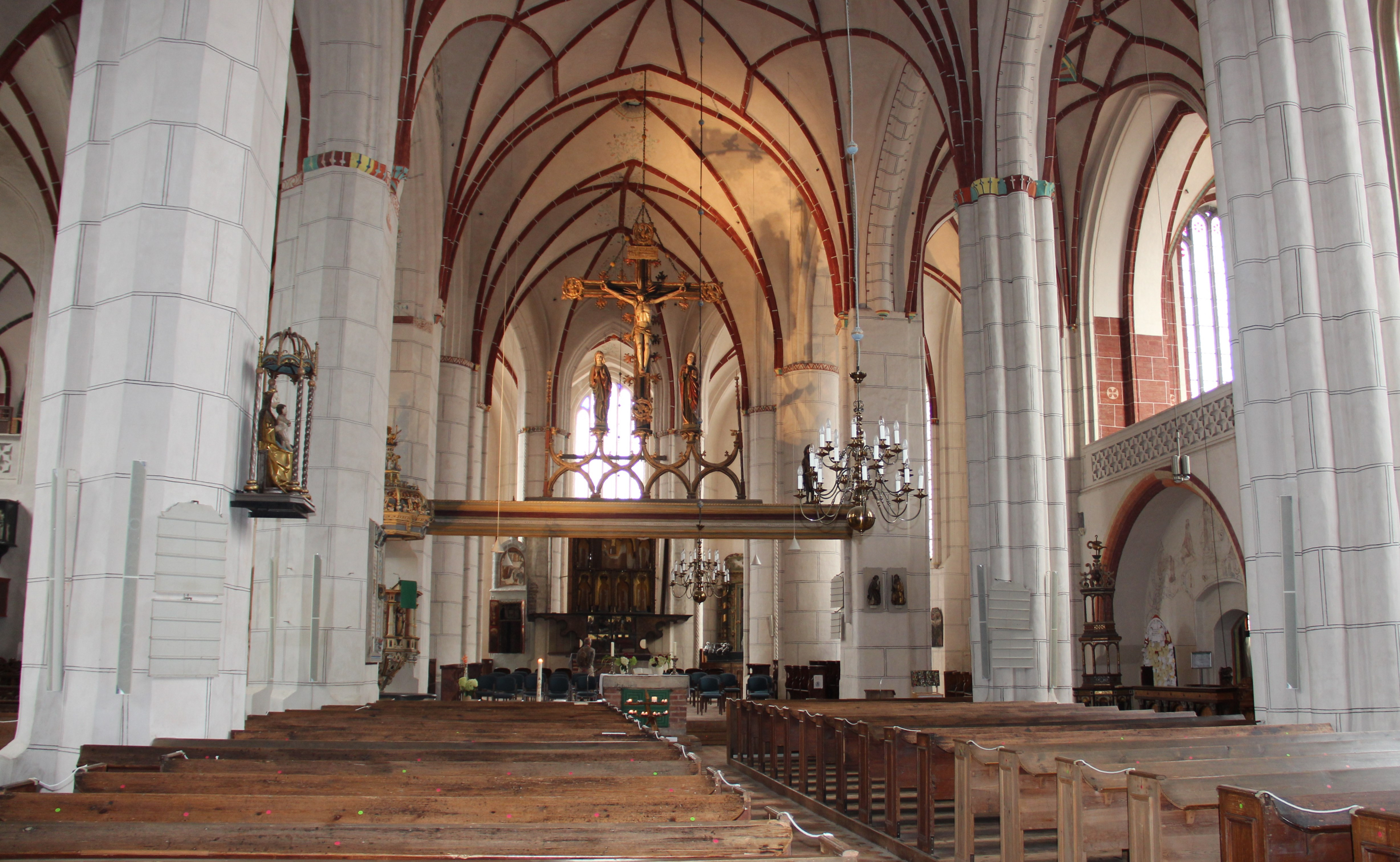 Die vierschiffige Backsteinhallenkirche, vermutlich spätromanisch, ist aus einem gotisch veränderten Feldsteinbau hervorgegangen. 1519 wurde sie vollendet. Der Bau ist 54,5 m lang und 30 m breit. Der ursprüngliche Doppelturm wurde 1846 durch den heutigen 57,4 m hohen Turm ersetzt. Der Marienaltar mit drei Schauseiten im Innern stammt aus dem 16. Jh.