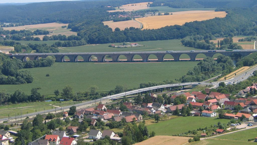 Die zur Bauzeit 1937-39/41 mit 794 m längste Brücke des deutschen Autobahnprogramms in Thüringen wurde aus Stampfbeton, Stahlbeton, Klinker sowie Naturstein errichtet. Die den Formen römischer Aquädukte entlehnte Monumentalität sollte den Ewigkeitsanspruch des NS-Regimes verdeutlichen.
