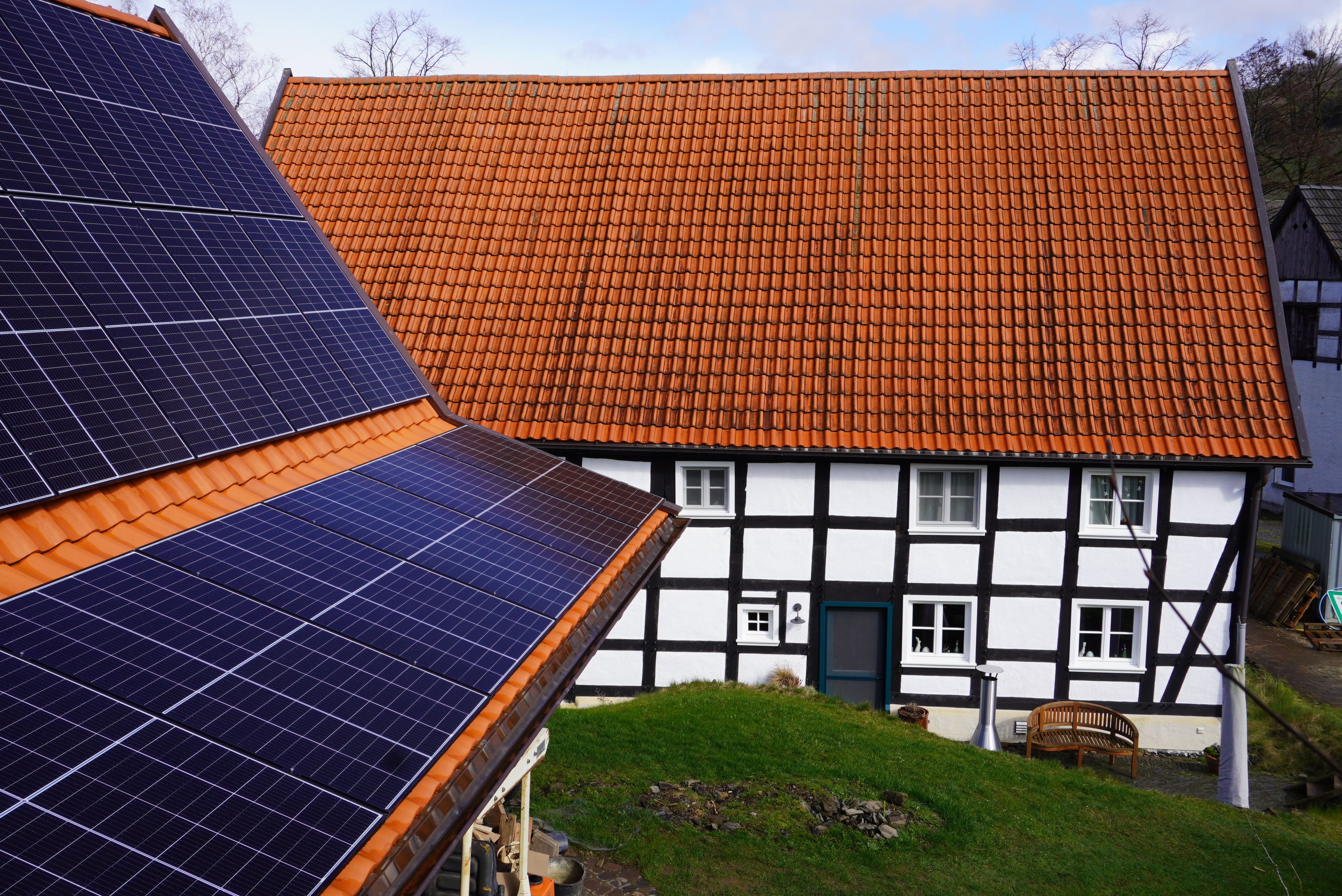 Saniertes Fachwerkhaus von 1750. Das niederdeutsche Hallenhaus in Sundern-Linnepe ist ein sehr gut erhaltenes Beispiel vorindustrieller Baukunst. Mit viel handwerklichem Geschick, ökologischen Materialien, moderner Heizung, Solartechnik und Dämmung wurde es saniert. So zeigt es, wie historisch wertvolle Bausubstanz nahezu klimaneutral und dennoch atmosphärisch genutzt werden kann.