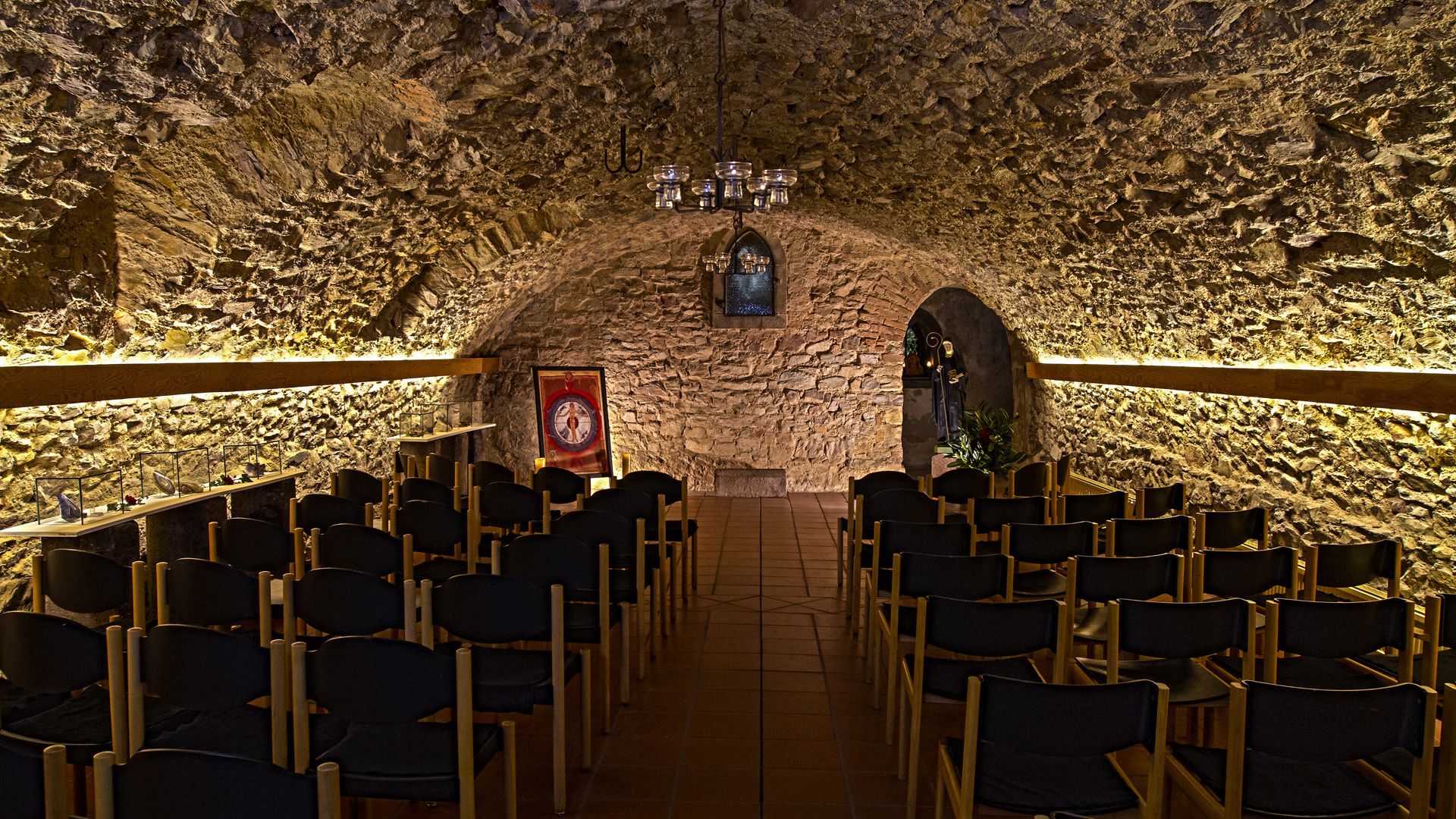 Kellergewölbe am Standort der ehemaligen Klosterkirche der Heiligen und Kirchenlehrerin Hildegard von Bingen auf dem Rupertsberg in Bingerbrück. Das ursprüngliche Kloster wurde ab 1150 erbaut. 1632 wurde es zerstört. Die Keller wurden im 19. Jh. in die Klosterruine gebaut und zunächst als Weinkeller genutzt. Heute, nach Gründung der Rupertsberger Hildegard-Gesellschaft Bingen e.V., ist das Kellergewölbe ein Ort der Begegnung mit dem Leben und Werk der Hildegard von Bingen.