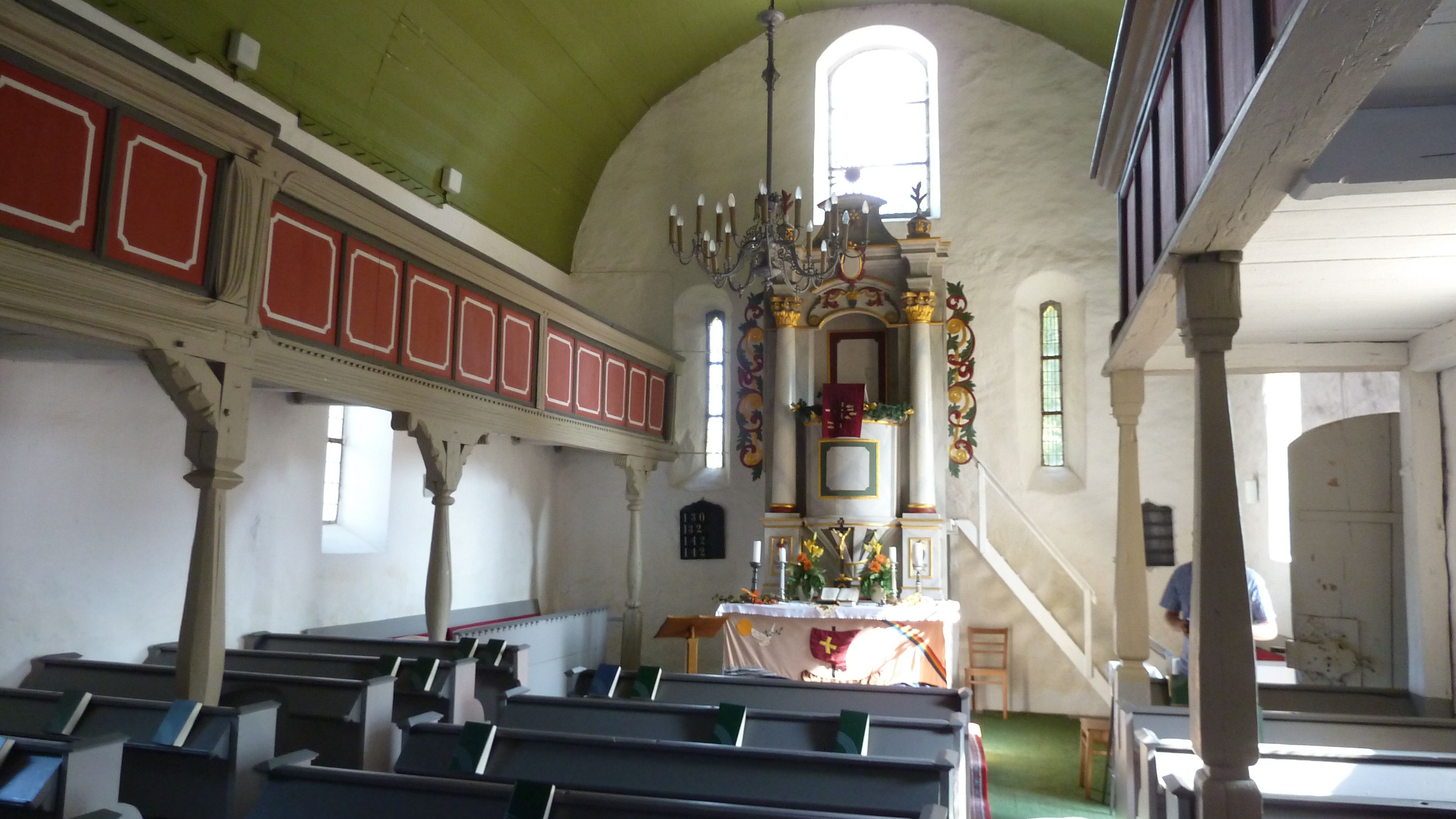 Feldsteinbau. Frühgotisches Kirchenschiff des 13. Jhs. Mittelalterliche Türbeschläge, Kanzelaltar von 1785 und Orgelprospekt aus dem 18. Jh.