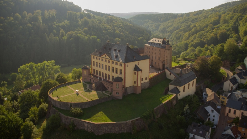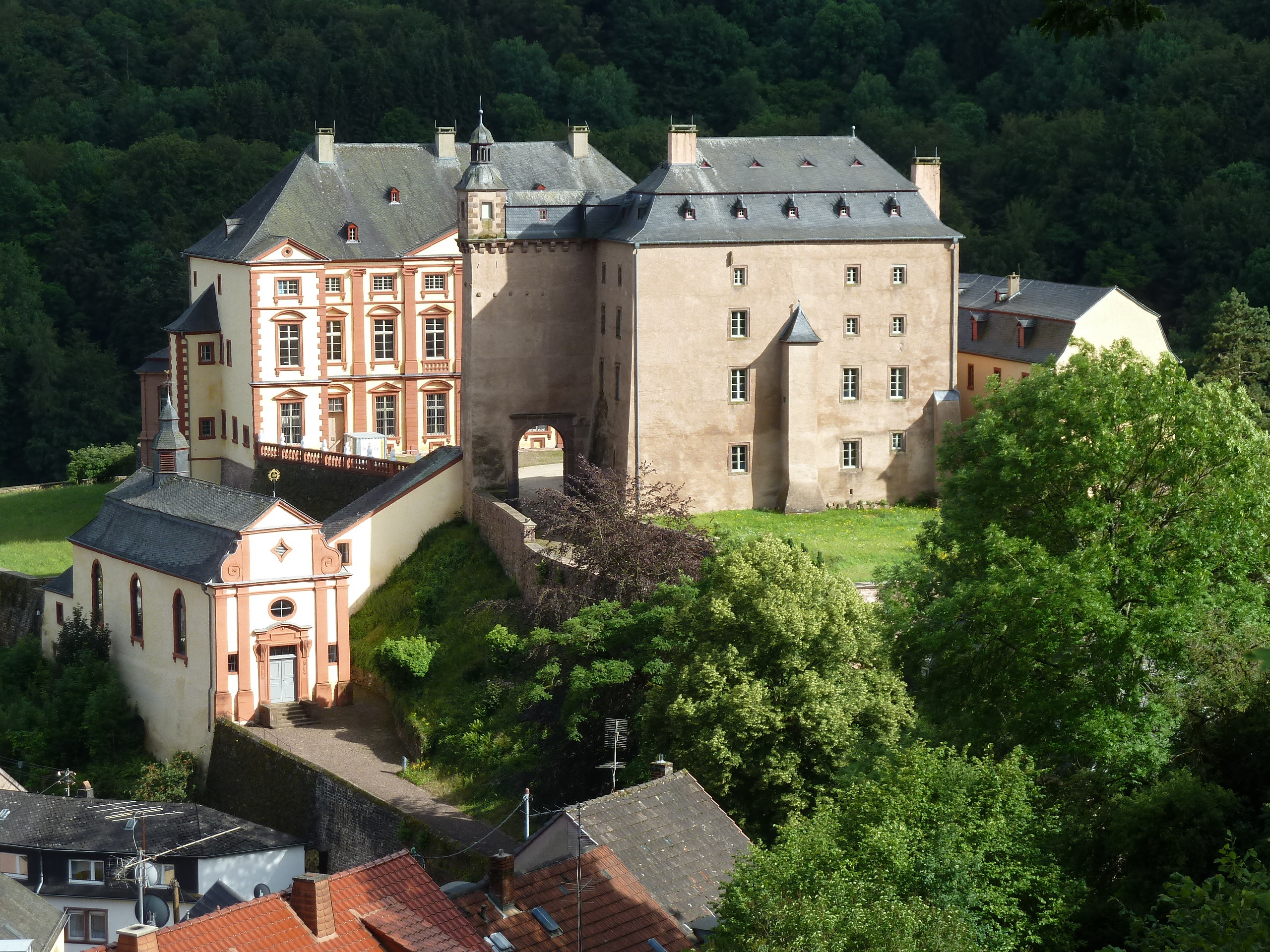 Die das Landschaftsbild beherrschende Schlossanlage liegt auf einem Bergrücken über der Kyll, 1707-15 nach Plänen des kurpfälzischen Hofarchitekten Matteo Alberti aus Düsseldorf erbaut. Als Rest der im Mittelalter gegründeten Burg steht das Alte Haus. 1712-14 wurde das Neue Haus durch Johann Werner von Veyder, Weihbischof von Köln errichtet, im Inneren repräsentative Räume mit Stuckdecken, Vertäfelungen und textilen Wandbespannungen, über den mächtigen Substruktionen Terrassen und Gartenanlagen.