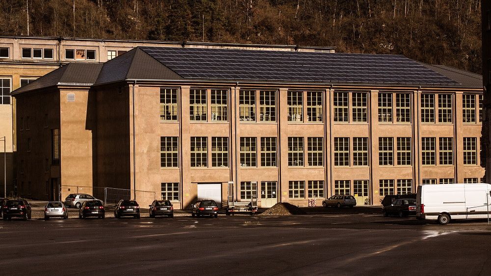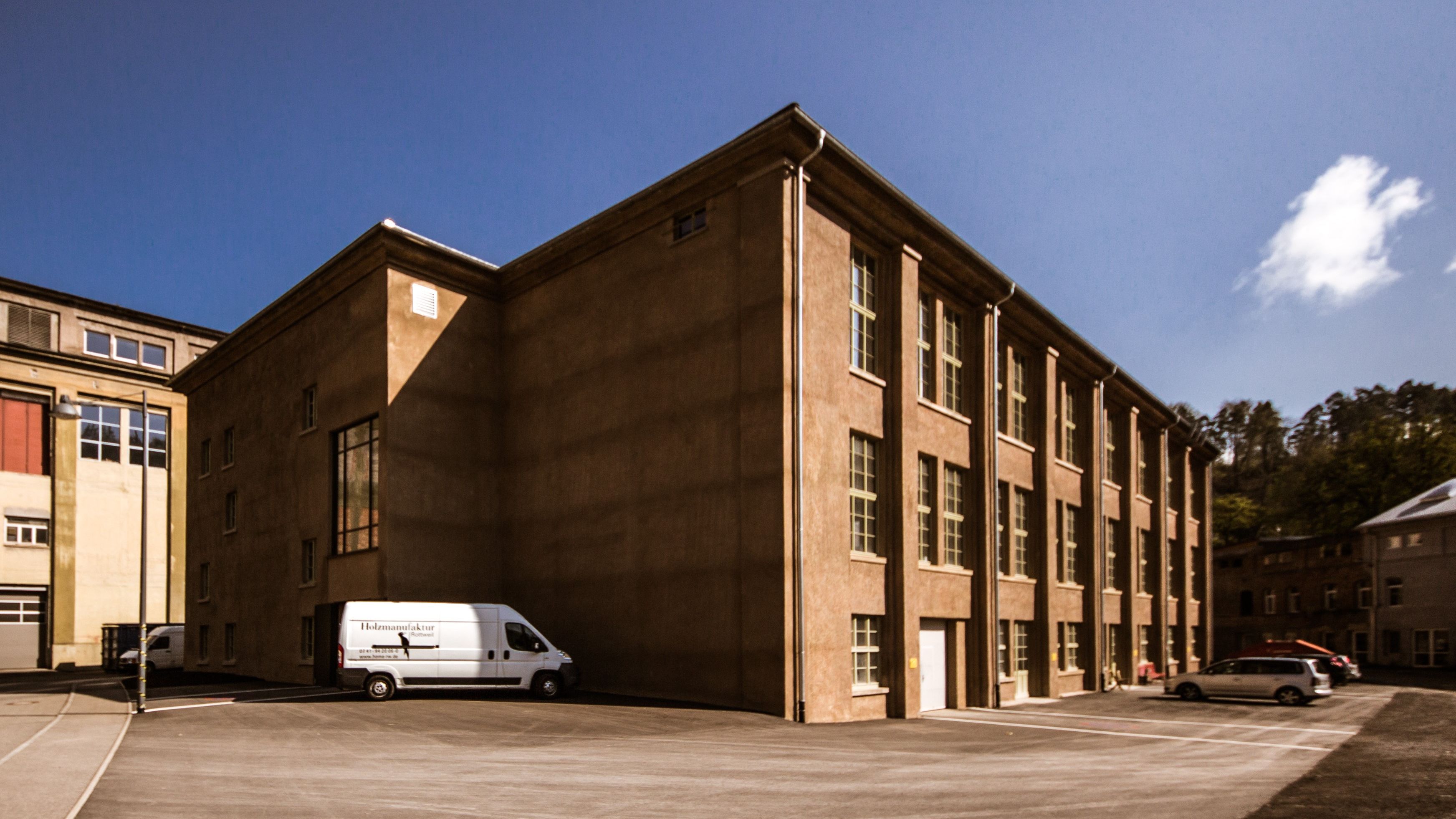 1938 errichtet, für die Herstellung von Fallschirmseide für die Rüstungsindustrie. Langgestrecktes Fabrikgebäude mit flachem Walmdach. Zwischen den sieben Pilastern aus verputztem Ziegelmauerwerk betonen große Fenster mit Sprosseneinteilung die Fassaden. Die zwei Treppenhäuser an den Stirnseiten erschließen das Obergeschoss, welches aus einem stützenfreien Saal besteht. Das Dachtragwerk ist aus Holz gefertigt. Im Sockelgeschoss der Rückseite befinden sich Luftschutzkeller für ca. 400 Personen.