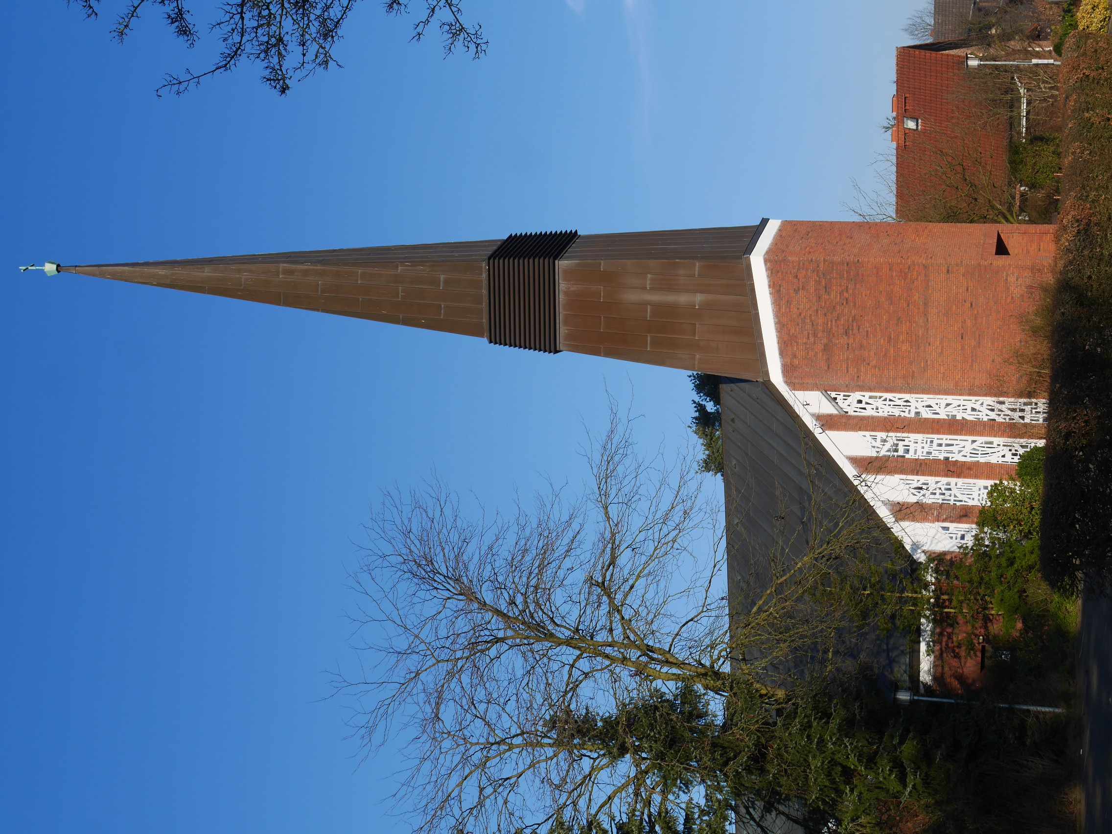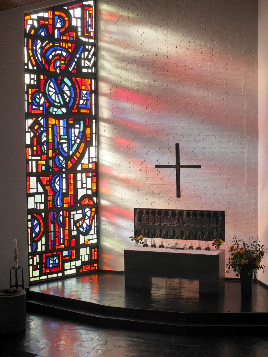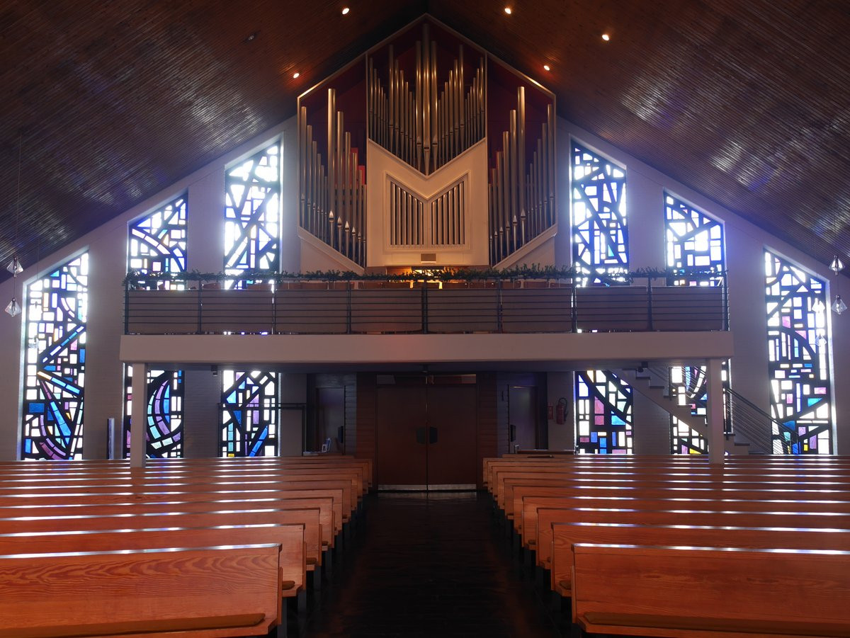 1958-62 erbaut vom Architekten Otto Andersen mit trapezförmigem Grundriss und 40 m hohem Turm. Drei Stahlguss-Glocken. Bemerkenswerte farbige Dall-Glasfenster von Ernst-Günter Hansing. Bronze-Retabel von Fritz Fleer mit der Darstellung des Abendmahls. 2013 in das Denkmalbuch Schleswig-Holstein eingetragen, da ein typisches Beispiel des Kirchenbaus der 1960er-Jahre.