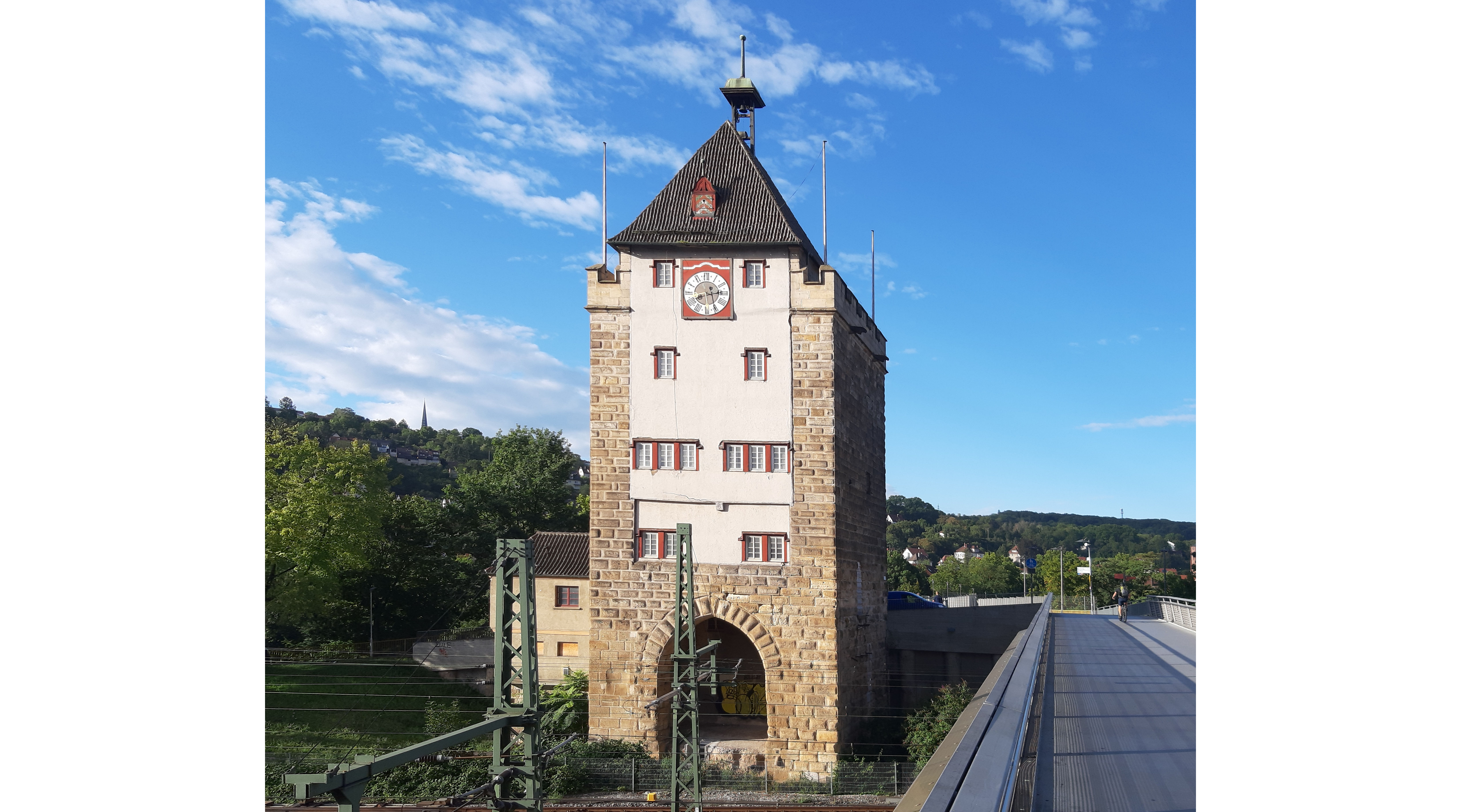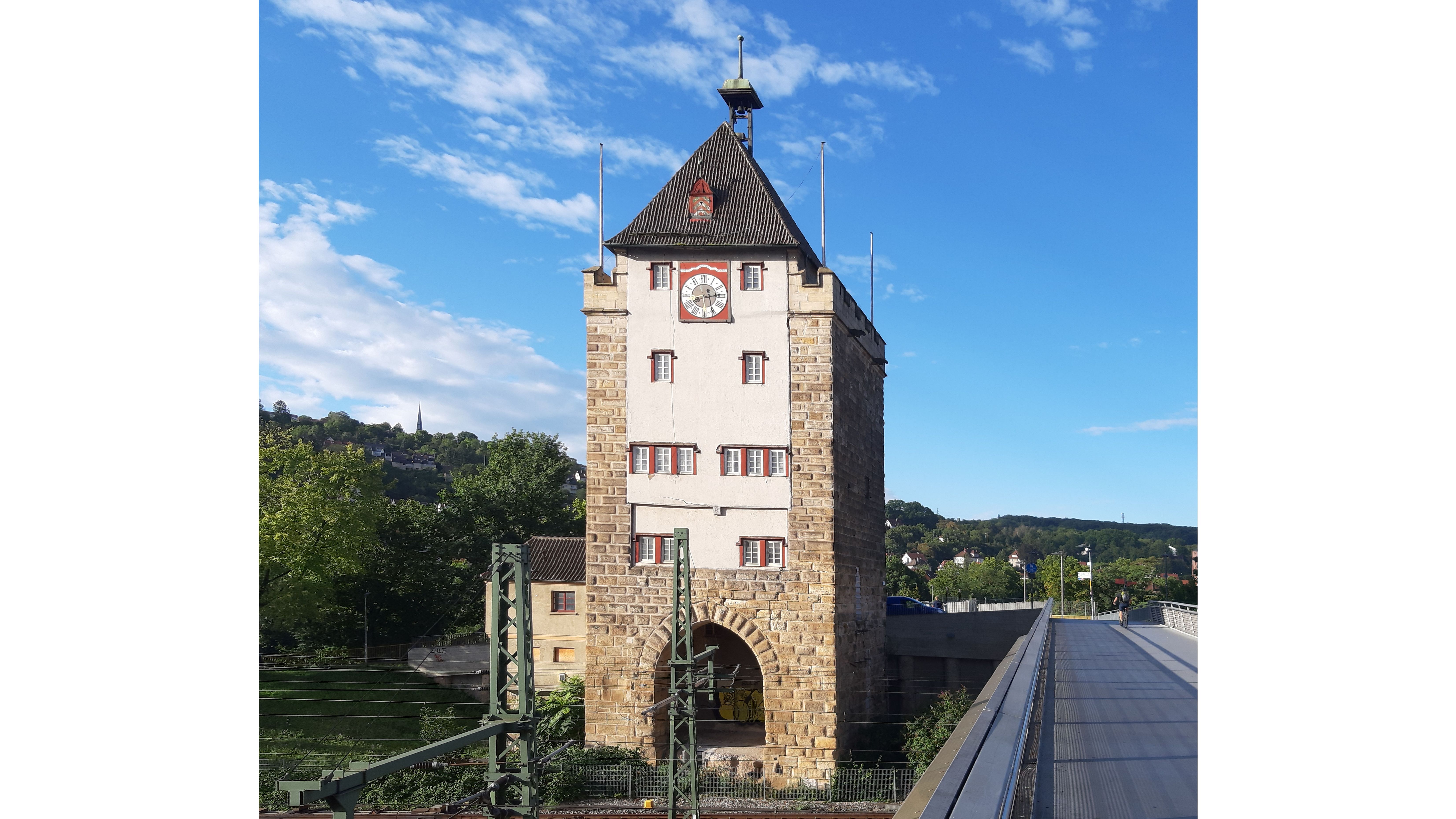 Am Ende der Pliensaubrücke 1444 weitgehend neu errichtet, war der Torturm bis ins 20. Jh. einer der wichtigsten Zugänge zur Stadt. Nachdem Uhr und südliches Ziffernblatt 2020 restauriert wurden, besteht derzeit vor allem an der stadtseitigen Fachwerkfassade des Schalenturms weiterhin dringender Handlungsbedarf.