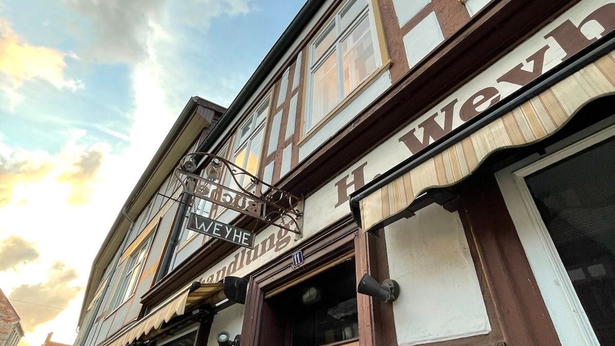 Die Buchhandlung ist über 150 Jahre in Familienbesitz Weyhe gewesen. Die historischen Verkaufsräume sind aus der zweiten Hälfte des 19. Jhs. mit einer unter Denkmalschutz stehenden Inneneinrichtung im Verkaufsraum. Es ist die Buchhandlung der ehemals ältesten Buchhändlerin Deutschlands Helga Weyhe (bis 01/2021) gewesen. Seit 06/2022 befindet sich das Gebäude im Eigentum der Solidarischen Wohnungsbaugenossenschaft TraWo eG. Mitglied der IG Bauernhaus