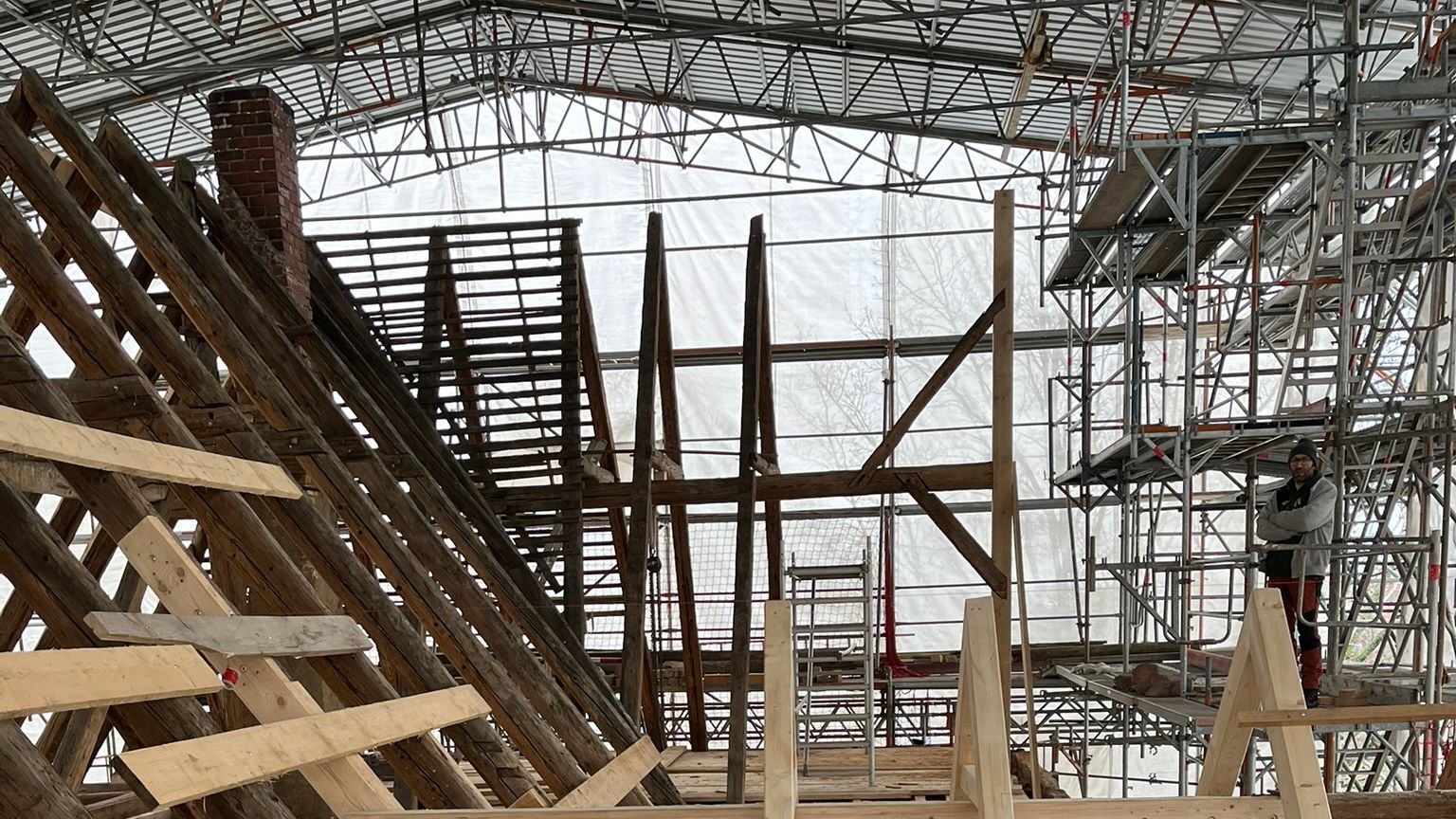 Dachstuhl, Fassade und Decken werden gerade saniert und restauriert. Besichtigungen sind innen einzeln oder in Gruppen und mit Führung möglich. Wir bieten in Zusammenearbeit mit dem Heimatverein und dem Verein Blau-Weiß-Ebersbach e.V. leckere Sachen vom Grill, Kaltgetränke, Kaffee und Kuchen an. Sitz- und Essgelegenheiten befinden sich im Park.