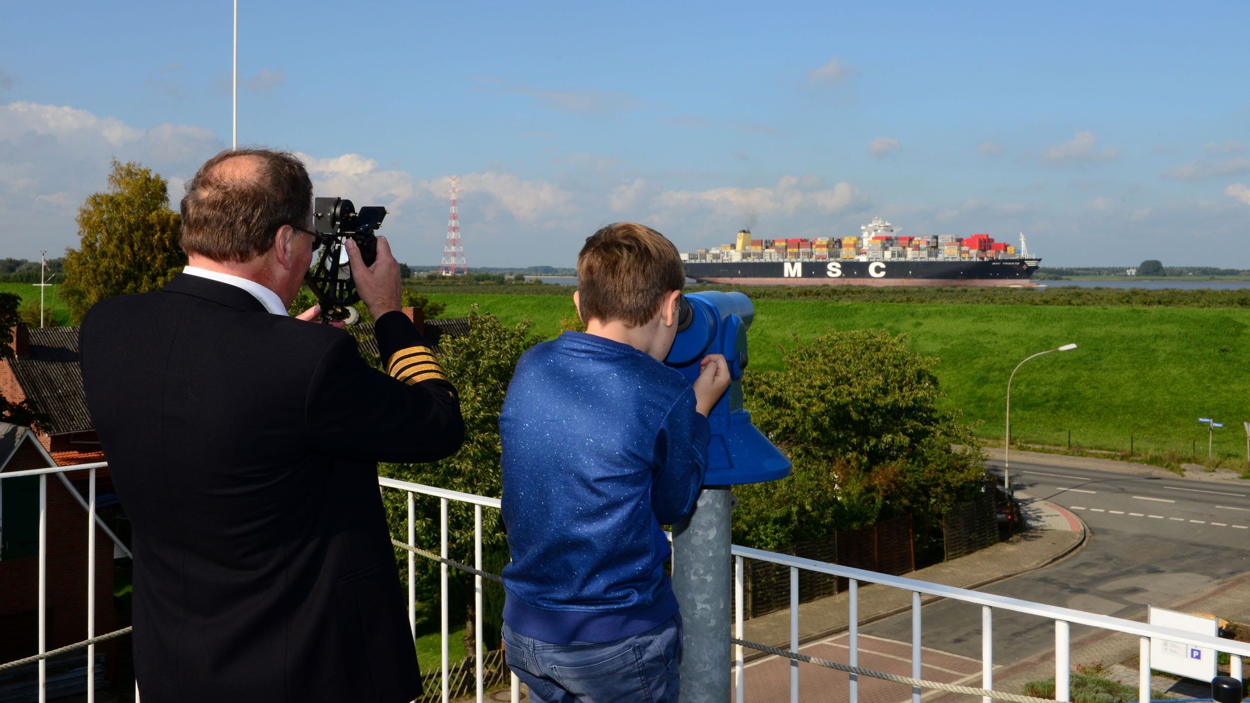 Kapitän a. D. Joachim Brill führt Besuchende die Alte Seefahrtsschule hinauf auf die Kapitänsbrücke mit Blick über die Elbe und das Alte Land. Dabei erzählt er spannende Geschichten aus dem früheren Betrieb, spannende Geschichten aus der Seefahrt und erklärt die Funktion und Handhabung nautischer Instrumente.