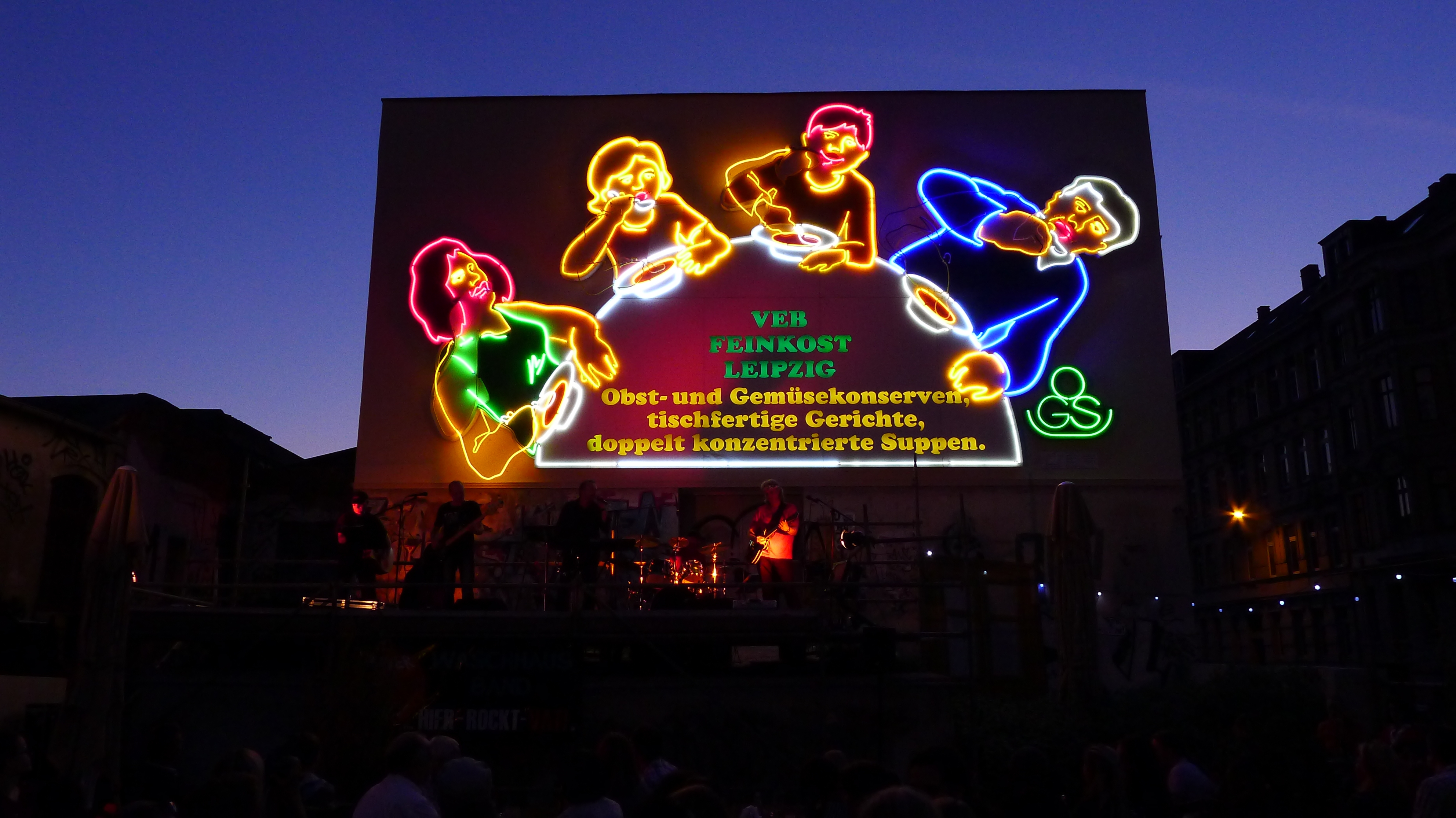 Beim Lichtkunstdenkmal Löffelfamilie handelt es sich um eine zwölf Meter breite und sieben Meter hohe Leuchtreklame aus 197 Einzelteilen und 194 Meter langen verschiedenfarbigen NEON-Leuchtröhren, die seit ca. 1975 aufgrund einer phasenweisen Schaltung eine Familie darstellt, die ihre Suppe löffeln.