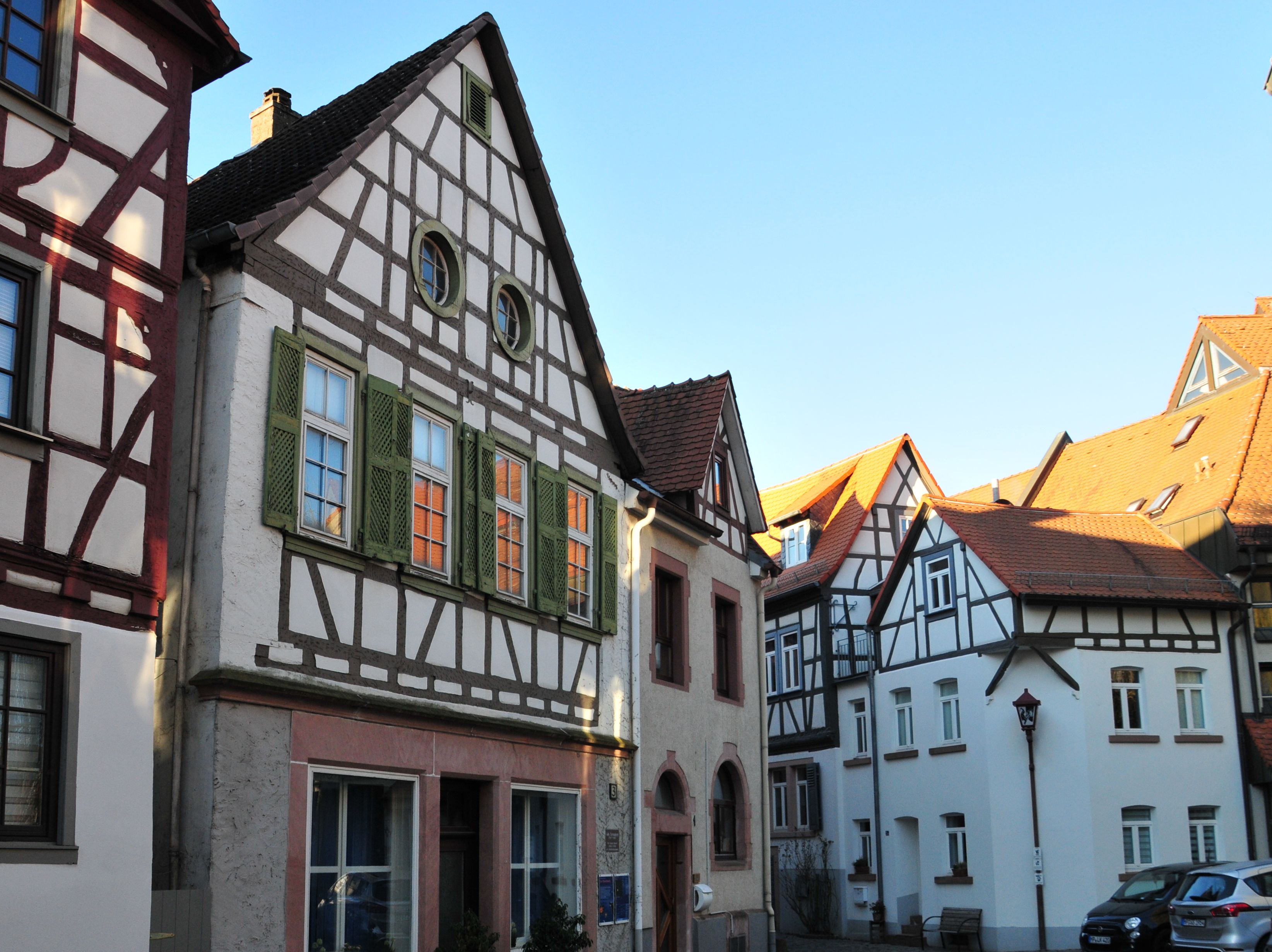 Baujahr ca. 1807 von der jüdischen Gemeinde Heppenheim als Synagoge mit Betsaal, Schule und Lehrerwohnung errichtet. Zweigeschossig mit Satteldach, Erdgeschoss und Längswände massiv, Fassade und Rückwand in Fachwerk mit zwei Rundfenstern im Giebel, die ursprünglich jeweils einen Davidstern zeigten. Ab 1901 keine Synagoge mehr. Erheblicher Umbau in ein Geschäftshaus für Kurz- und Weißware mit großzügigen Schaufenstern. Ab 1936 Friseurgeschäft mit Wohnung im Obergeschoss.