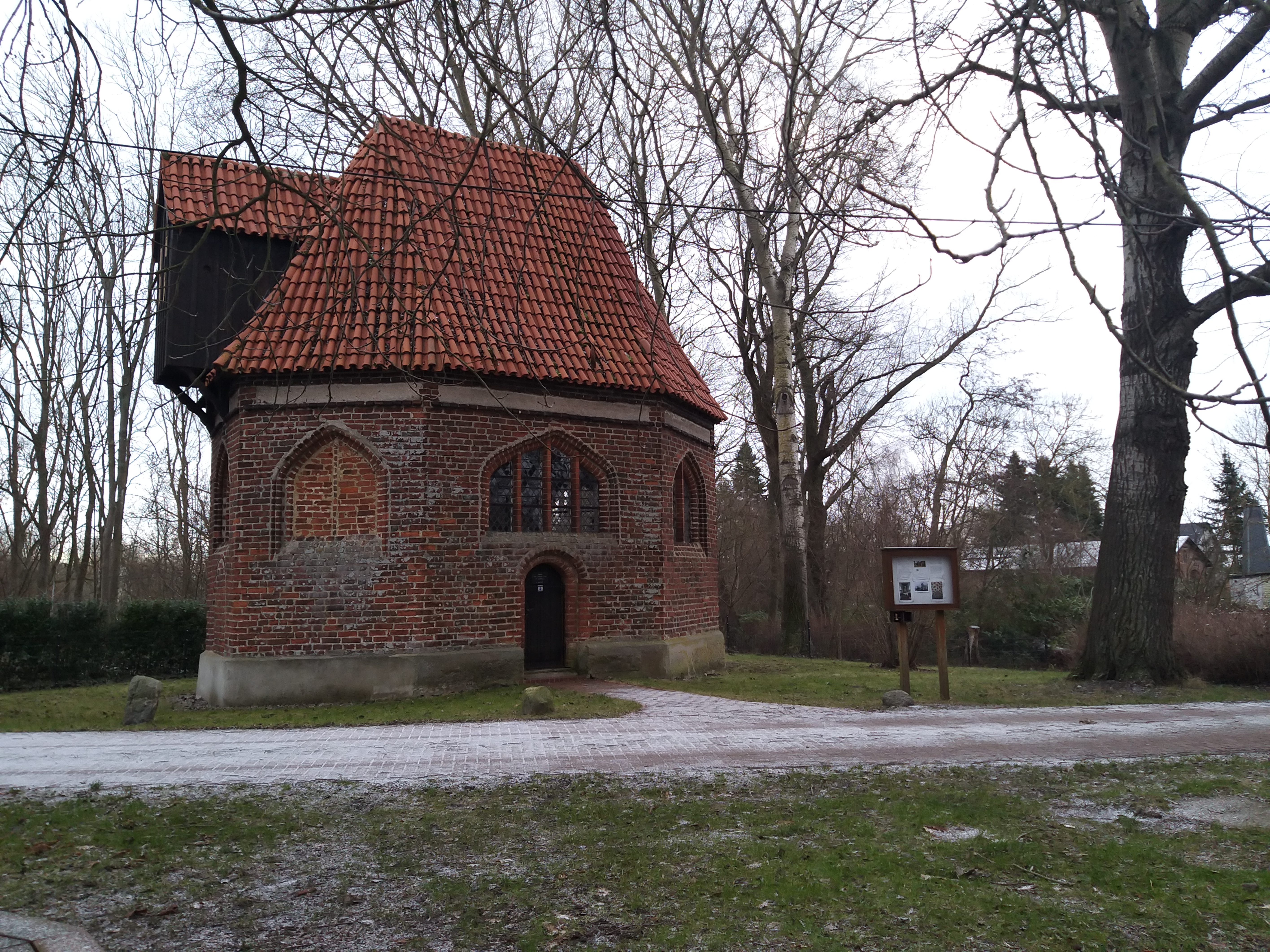 Die Kapelle „Zum Heiligen Kreuz“ wurde als achteckiger, gotischer Backsteinbau Ende des 15. Jahrhunderts vom Stralsunder Bürgermeister Matthias Darne gestiftet. Sie steht auf einem Kalksandsteinsockel und hat eine Dacheindeckung mit „Mönch und Nonne“ - Ziegeln. Im 17. Jahrhundert erhielt die Kapelle ihren Glockenerker. Die Glocke selbst stammt bereits aus dem 15. Jahrhundert. Trotz der geringen Ausmaße ziert das Innere ein prunkvoller Kanzelaltar von 1742/43.