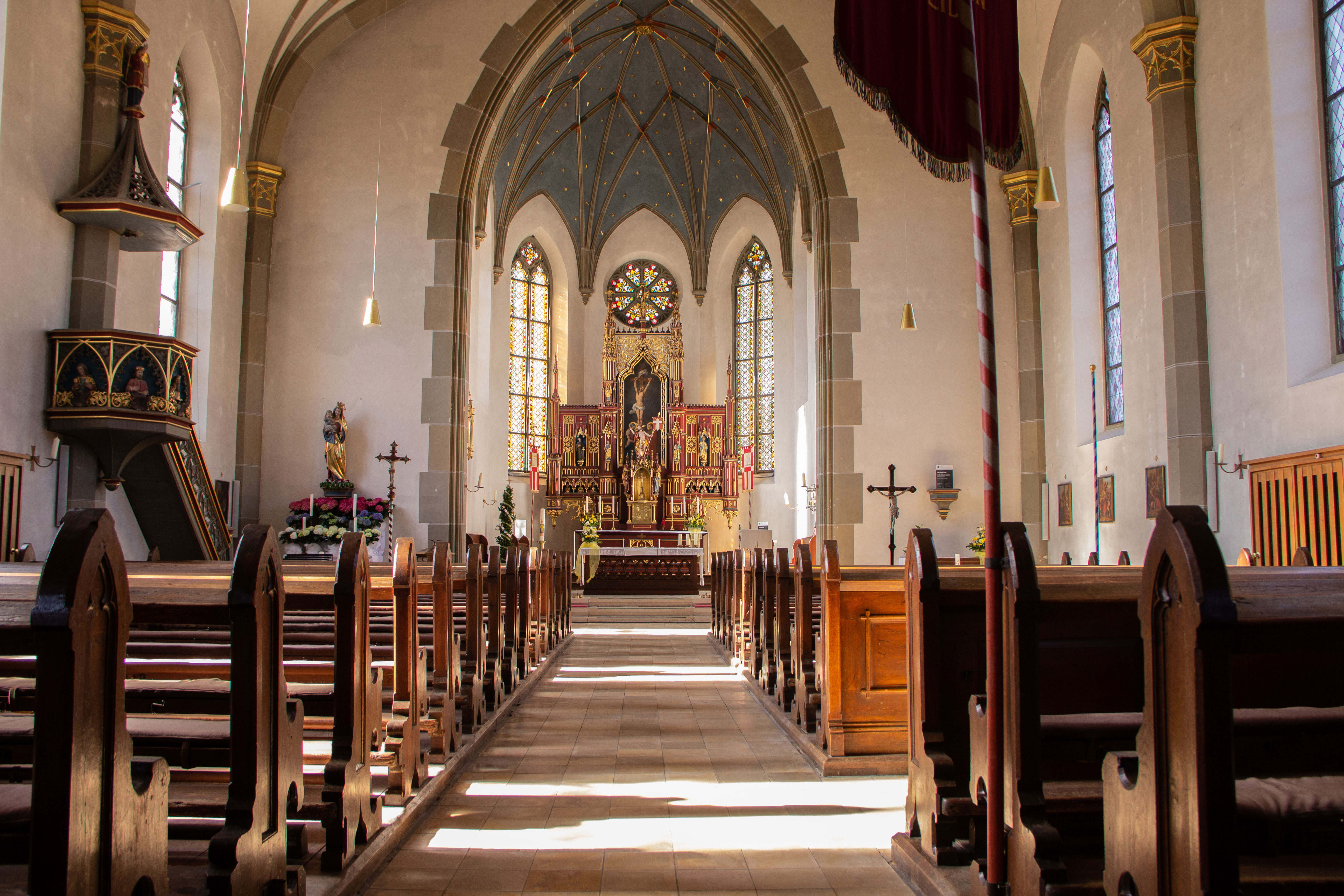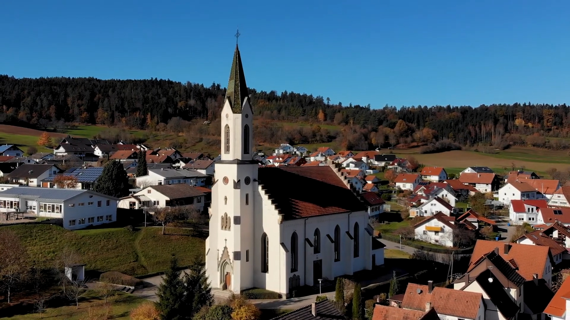 Zeugnis der Neugotik. Erbaut wurde die Kirche nach Plänen des Baurates Zobel aus Sigmaringen in den Jahren 1847-50. Sie thront auf einer eigens dafür geschaffenen Anhöhe im Zentrum des Ortes. Das Tudorbogen-Gewölbe bindet weit in den liegenden Dachstuhl ein. Die Innenausstattung wurde 1854 vom Bildhauer und Begründer der Horber Bildhauerschule Johann Nepomuk Meintel erschaffen.