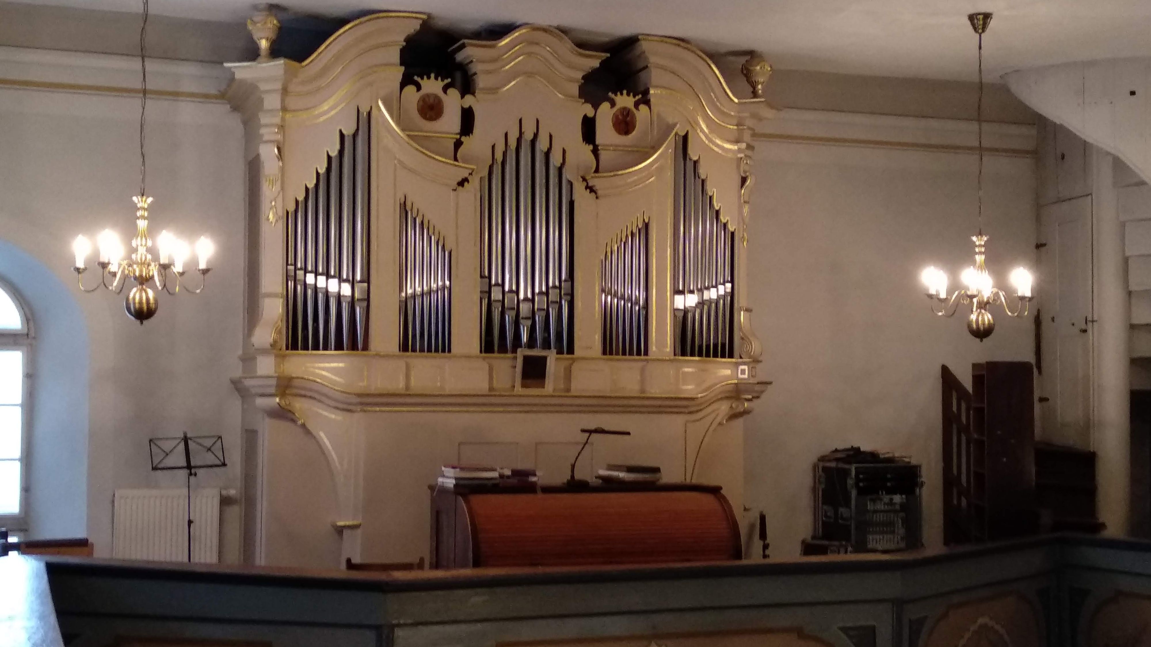 1691 geweiht, 1787 Ergänzung um einen Turm mit Zwiebelhaube, sehr schlichter Innenraum.