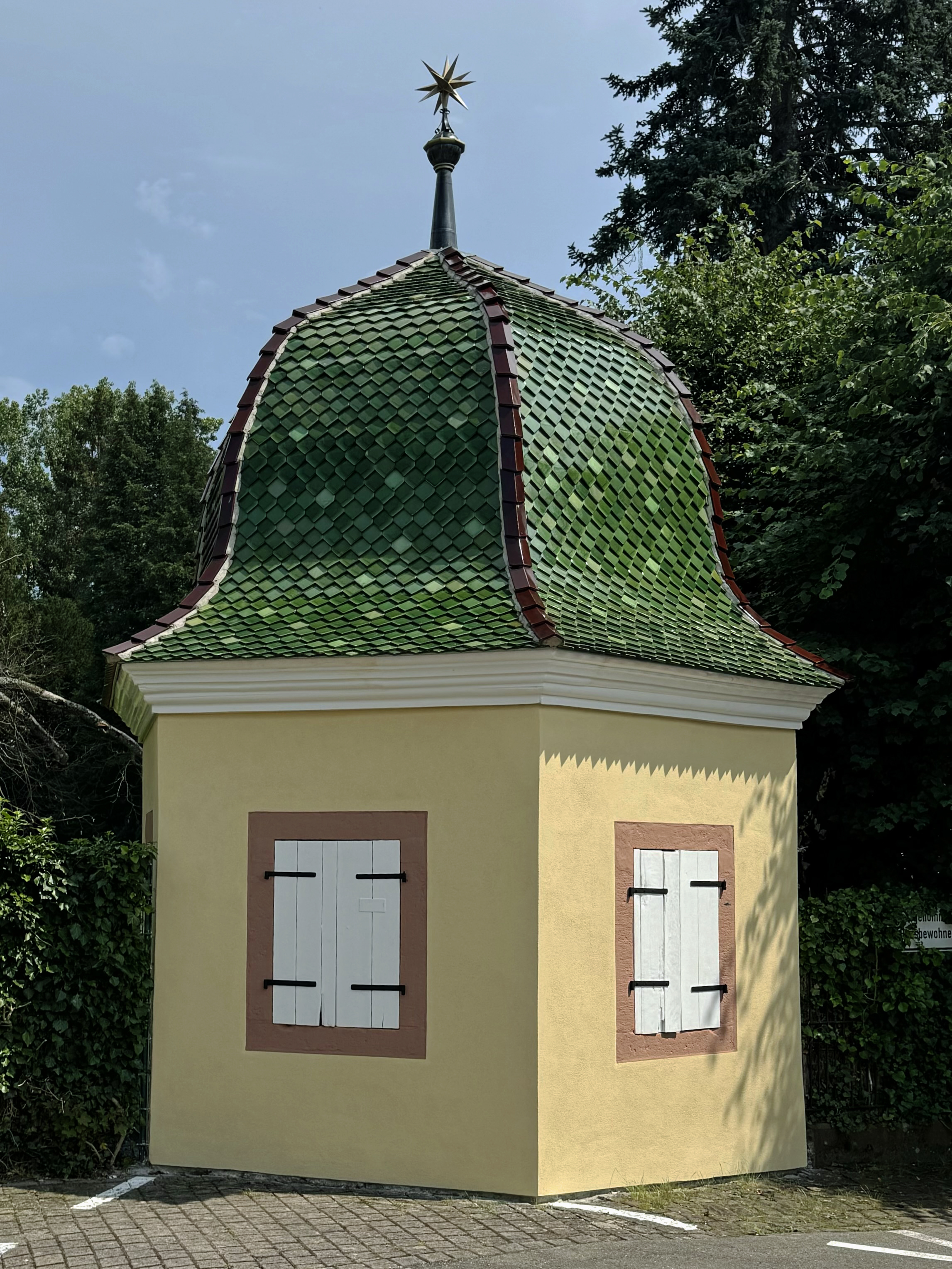 Schloss Königsbach ist ein Kulturdenkmal von besonderer Bedeutung. Es ist dieses Jahr 650 Jahre alt und wurde ursprünglich als Wasserschloss gebaut. Heute liegt es hinter den Bäumen eines Parks eher versteckt. Die Anlage besteht neben dem Schloss aus Torhaus, Meierei mit Zehntscheune und zwei barocken Pavillons. Die Zwiebelhaube eines der Pavillons konnte gerade dank öffentlicher Förderung mit glasierten Dachsteinen neu eingedeckt werden.
