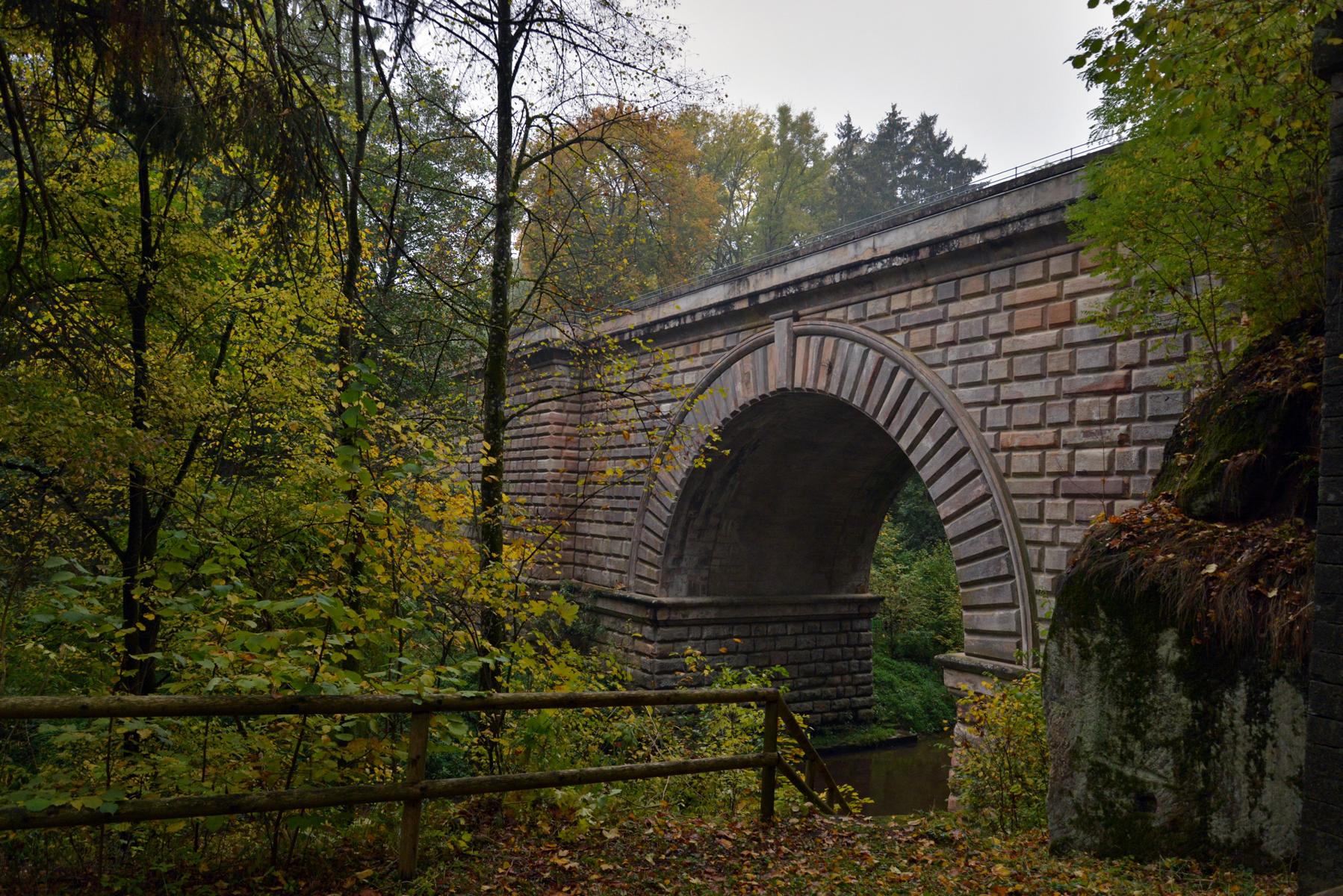 Das Bauwerk wurde die für Überbrückung des Schwarzachtals im Rahmen des Ludwig-Donau-Main-Kanals gebaut und 1841 fertiggestellt, mit einer Länge von 90 Metern, Breite von über 6 Metern und Bogenhöhe von 17 Metern. Vom Raum innerhalb des Brückenpfeilers aus kann die Bogenkonstruktion von unten betrachtet werden.