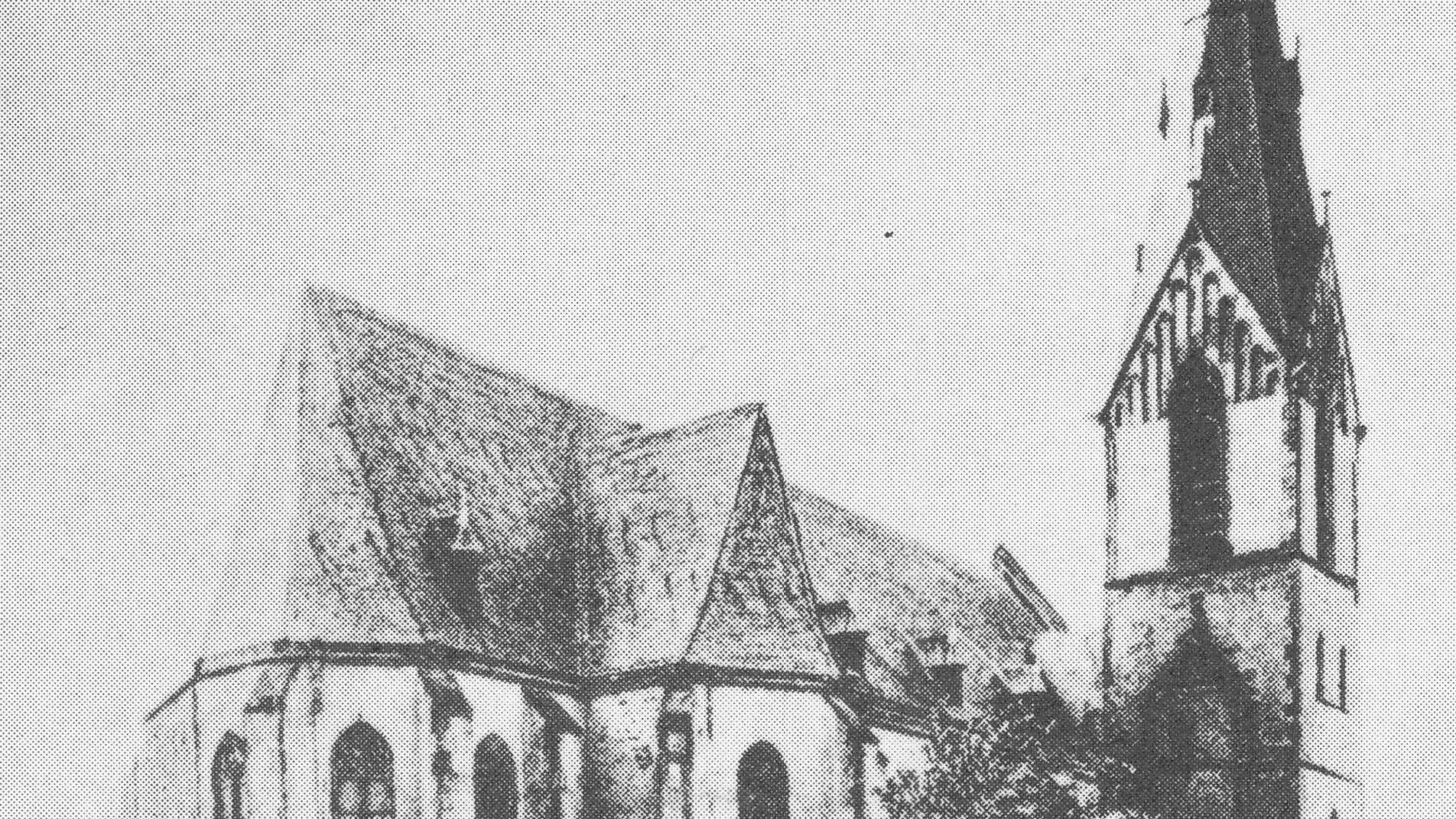 Die neugotische Kirche wurde 1892-93 nach Plänen von Max Meckel erbaut mit zwei Schiffen, einem Chorraum, hohen Gewölben, einer Orgelempore und einem Turm an der hinteren Ostseite. 1943 wurden bei einem Fliegerangriff Dach und Turmhelm völlig zerstört, das Innere brannte aus. 1946-1950 erfolgte der Wiederaufbau. Das Ergebnis ist beispielhaft für einen gelungenen, nicht nur historisierenden Wiederaufbau, bei dem bewusst moderne Elemente integriert wurden.