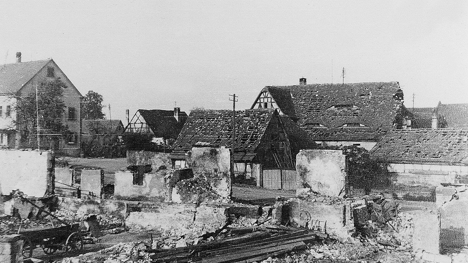 Im April 1945 – also vor genau 80 Jahren – kurz vor Kriegsende legten Granaten und Bomben Hellmitzheim und die Nachbarorte in Schutt und Asche. Die Kirchenburg war ein rauchender Trümmerhaufen, der Kirchturm ausgebrannt und geborsten, die letzte Glocke heruntergestürzt. Das Pfarrhaus und das Rathaus, fast jedes zweite Wohnhaus und über ein Drittel der landwirtschaftlichen Anwesen waren ganz oder zum Teil zerstört. Mit Hinweisen zu dieser Zeit erinnern wir im Denkmal Bürgerhaus und Kirche daran.