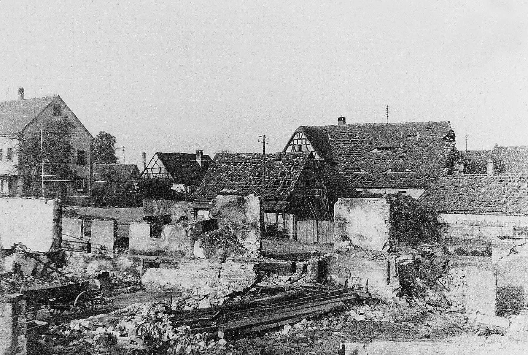 Im April 1945 – also vor genau 80 Jahren – kurz vor Kriegsende legten Granaten und Bomben Hellmitzheim und die Nachbarorte in Schutt und Asche. Die Kirchenburg war ein rauchender Trümmerhaufen, der Kirchturm ausgebrannt und geborsten, die letzte Glocke heruntergestürzt. Das Pfarrhaus und das Rathaus, fast jedes zweite Wohnhaus und über ein Drittel der landwirtschaftlichen Anwesen waren ganz oder zum Teil zerstört. Mit Hinweisen zu dieser Zeit erinnern wir im Denkmal Bürgerhaus und Kirche daran.