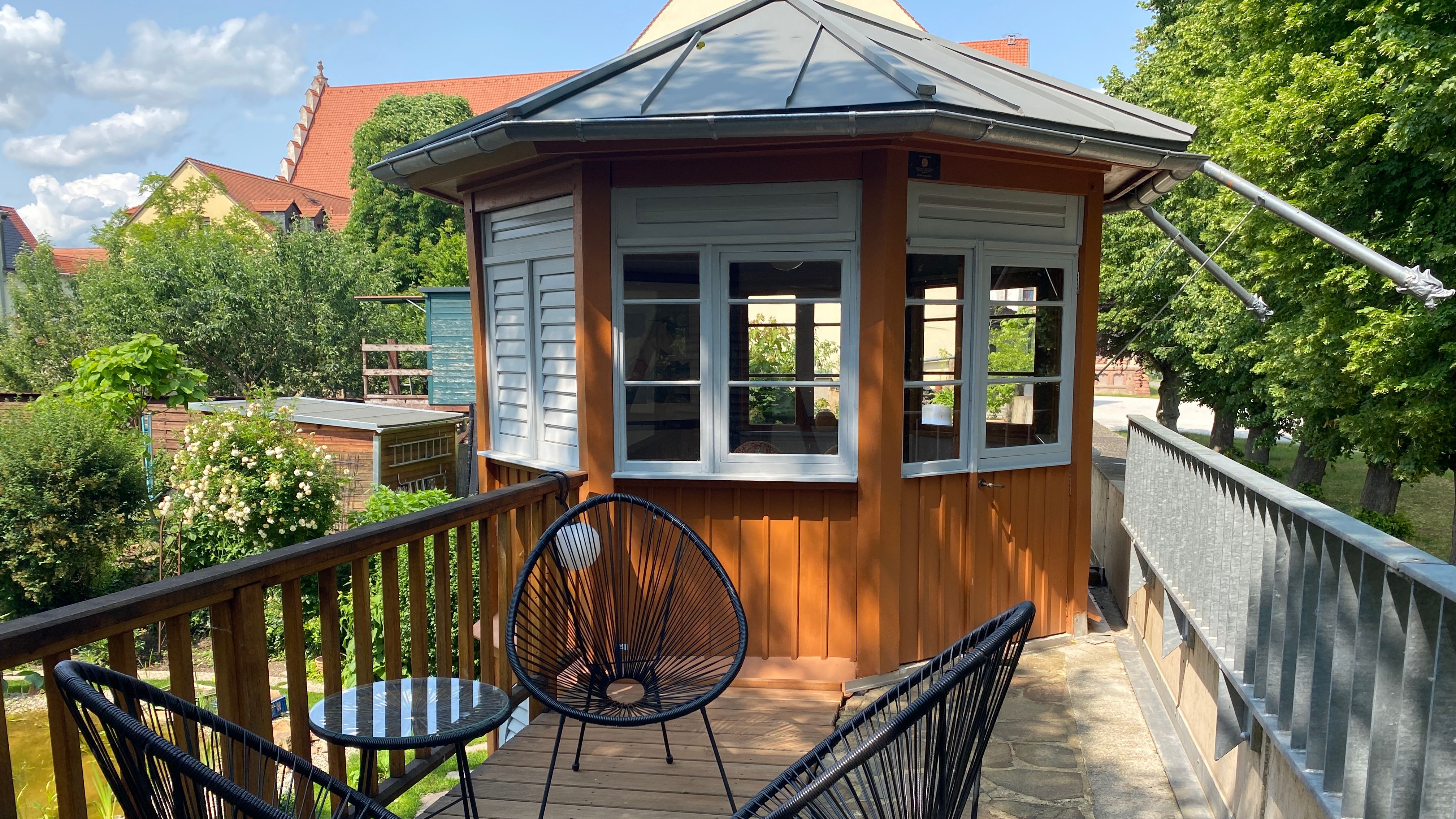 Achteckiger, zweigeschossiger hölzerner Gartenpavillon auf der Stadtmauer in landschaftsgestaltender Lage zur Mulde hin. In den letzten Jahren wurde vor der historischen Stadtmauer, auf der der Pavillon um 1920 erbaut wurde, eine Hochwasserschutzanlage errichtet. Dies alles ist vom Grundstück aus zu besichtigen.
