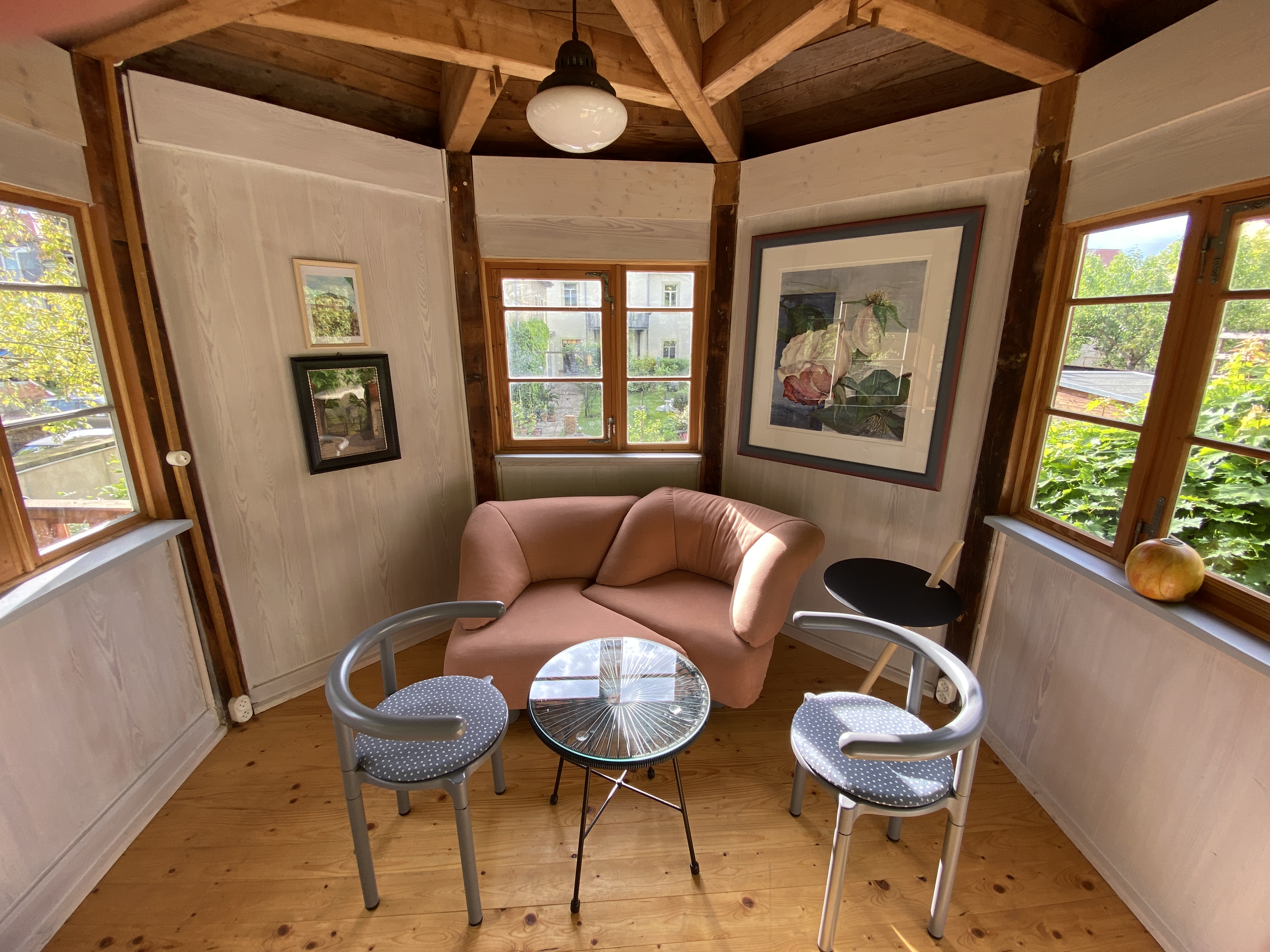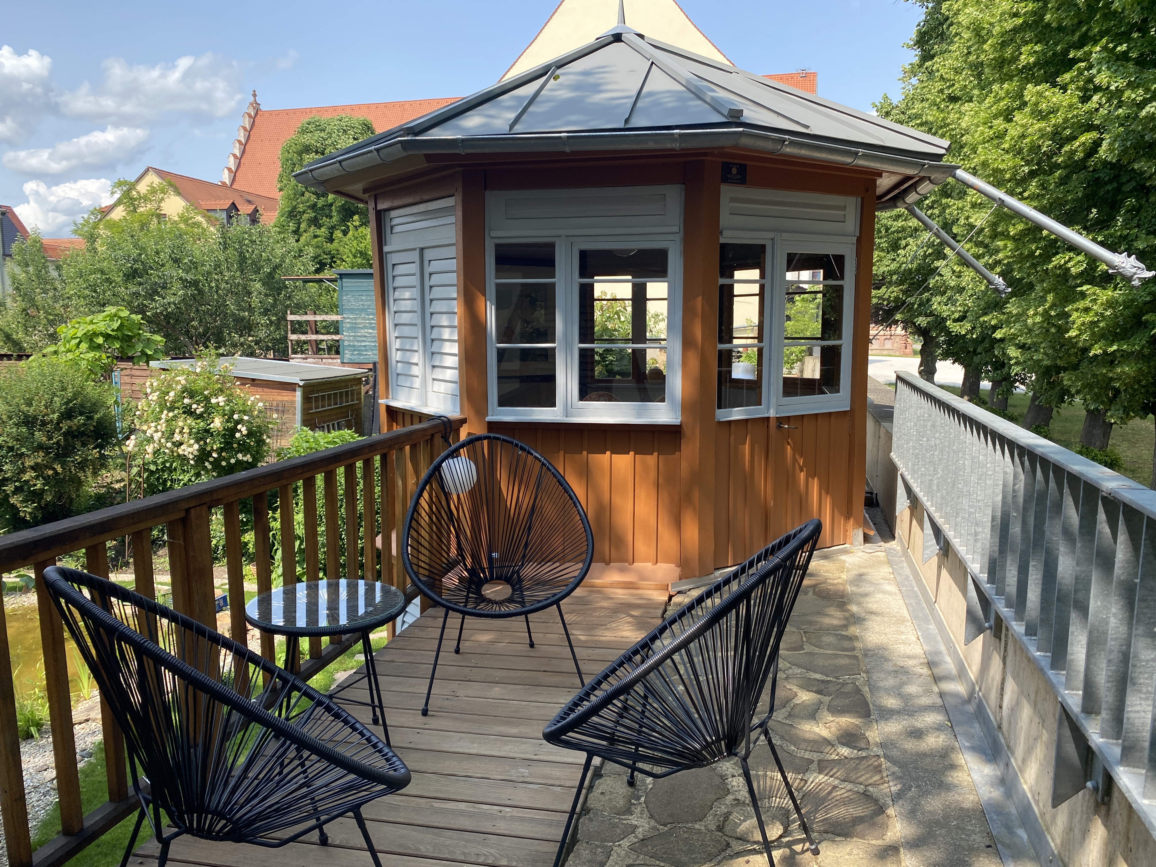 Achteckiger, zweigeschossiger hölzerner Gartenpavillon auf der Stadtmauer in landschaftsgestaltender Lage zur Mulde hin. In den letzten Jahren wurde vor der historischen Stadtmauer, auf der der Pavillon um 1920 erbaut wurde, eine Hochwasserschutzanlage errichtet. Dies alles ist vom Grundstück aus zu besichtigen.