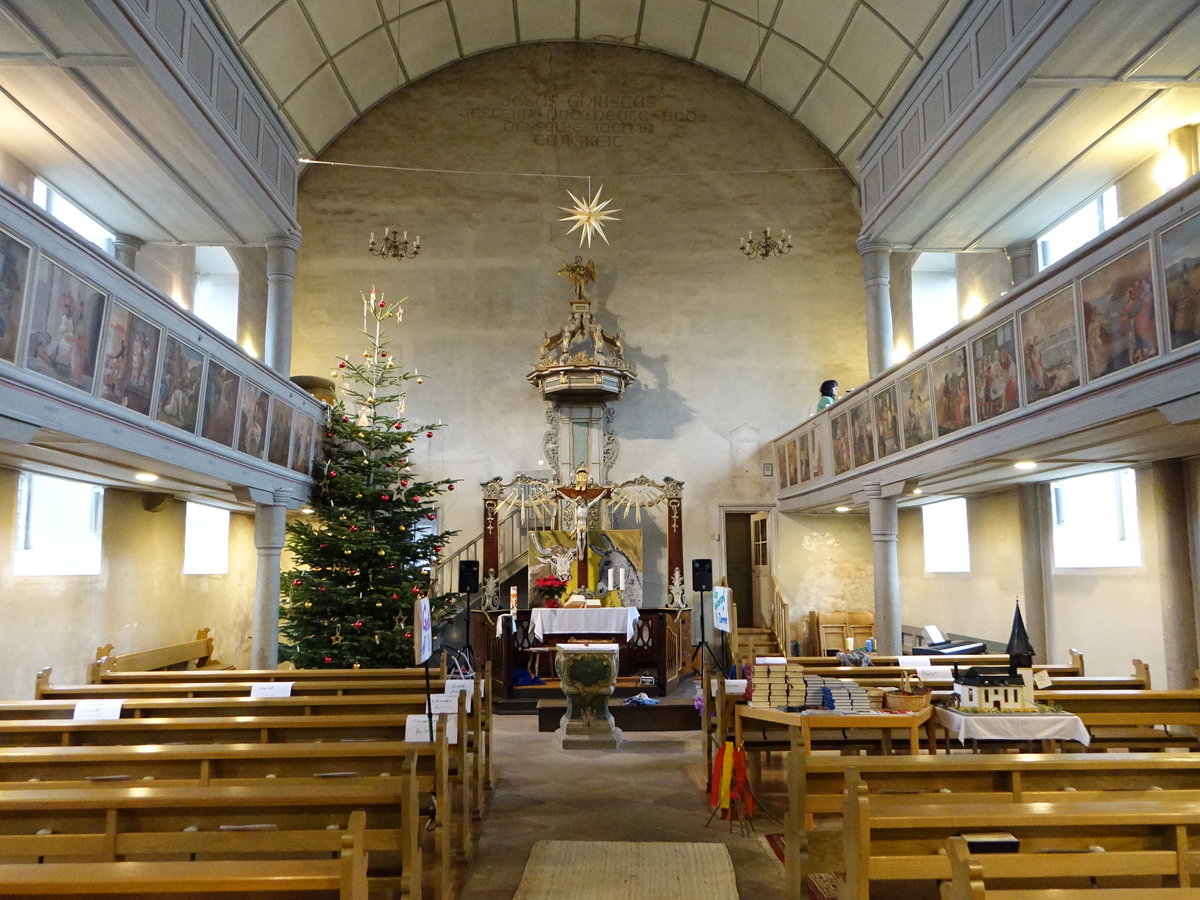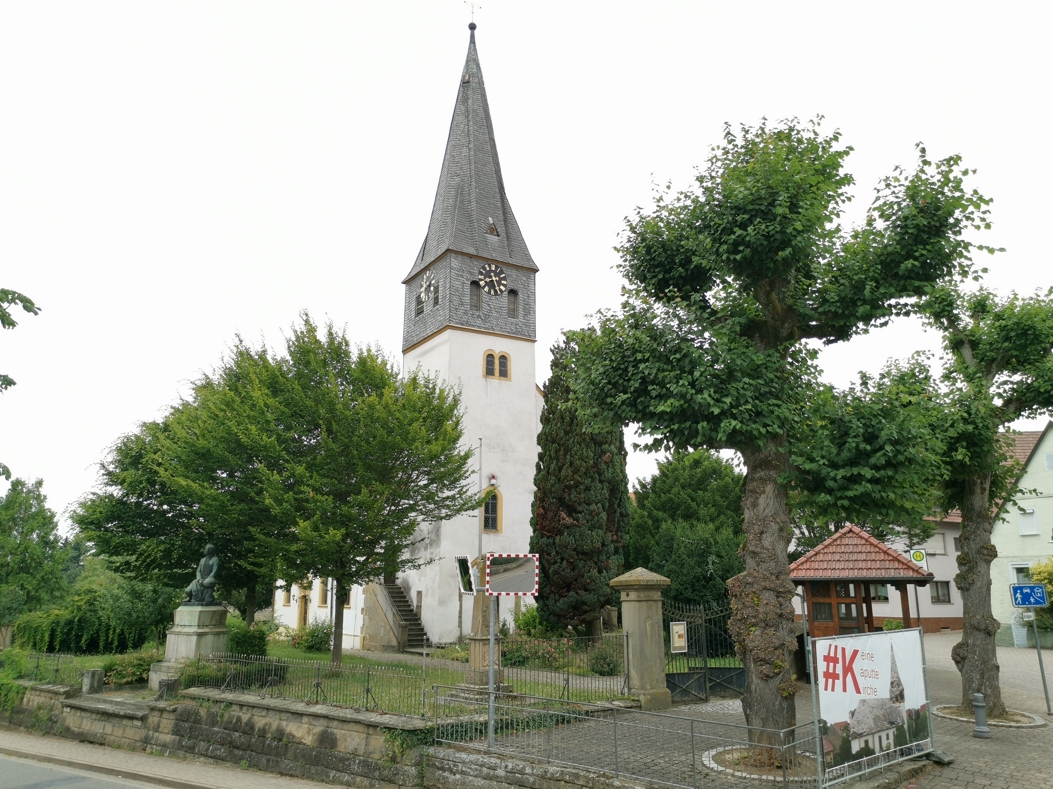 Die Hüffenhardter Dorfkirche wurde 1738 im Barockstil unter der Grundherrschaft der Freiherren von Gemmingen erbaut. Sie steht auf den Grundmauern der Vorgängerkirche und wurde an den mittelalterlichen Chorturm angebaut. Der Innenraum des Kirchenschiffs ist überspannt mit einem Tonnengewölbe; an drei Seiten befindet sich eine zweistöckige hölzerne Empore.
