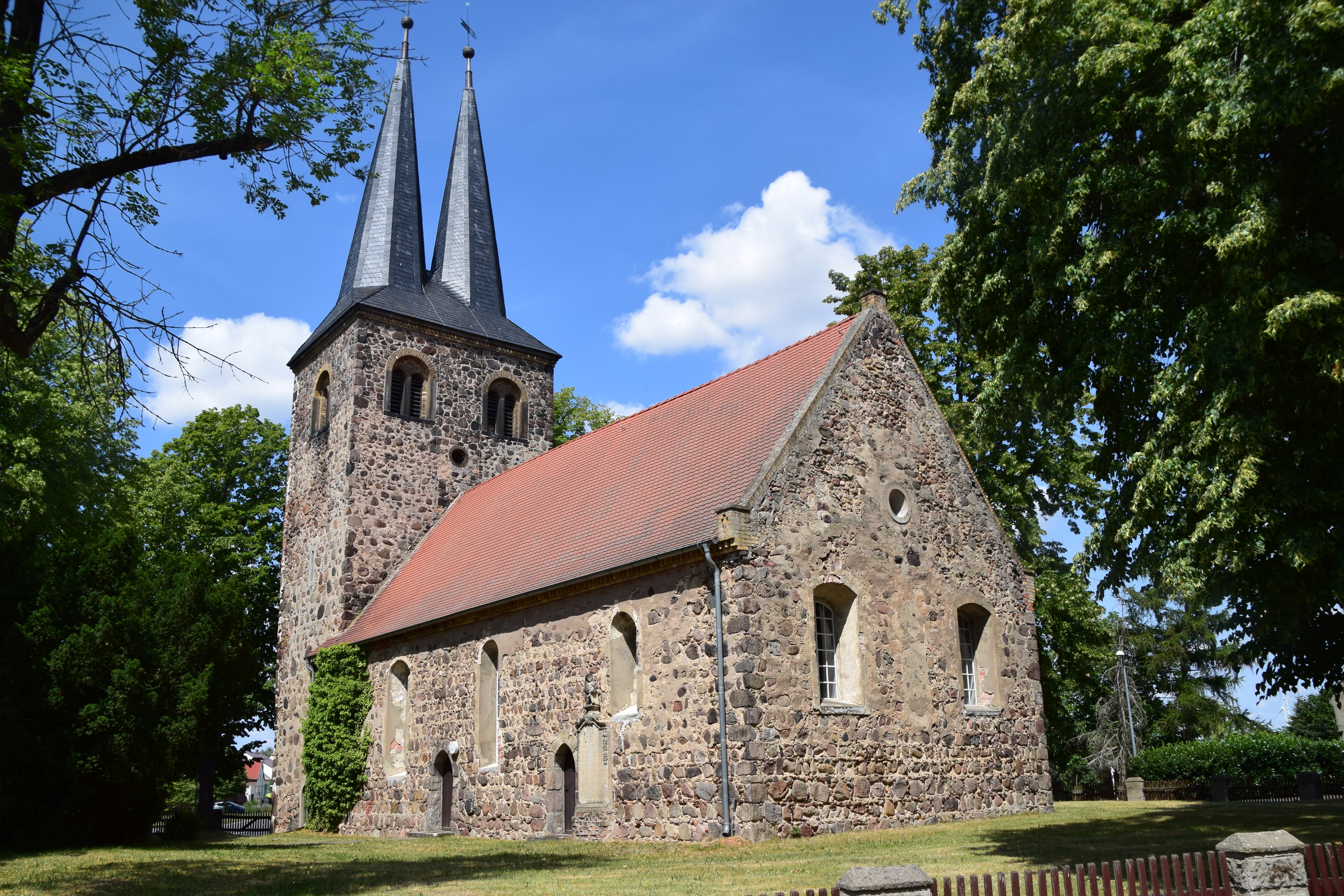 gotische Feldsteinkirche aus dem 13. Jh. einzige Kirche in der Region mit Doppelturmspitze Orgel von Ferdinand Wäldner (1874) 2020 saniert schlichte Ausstattung