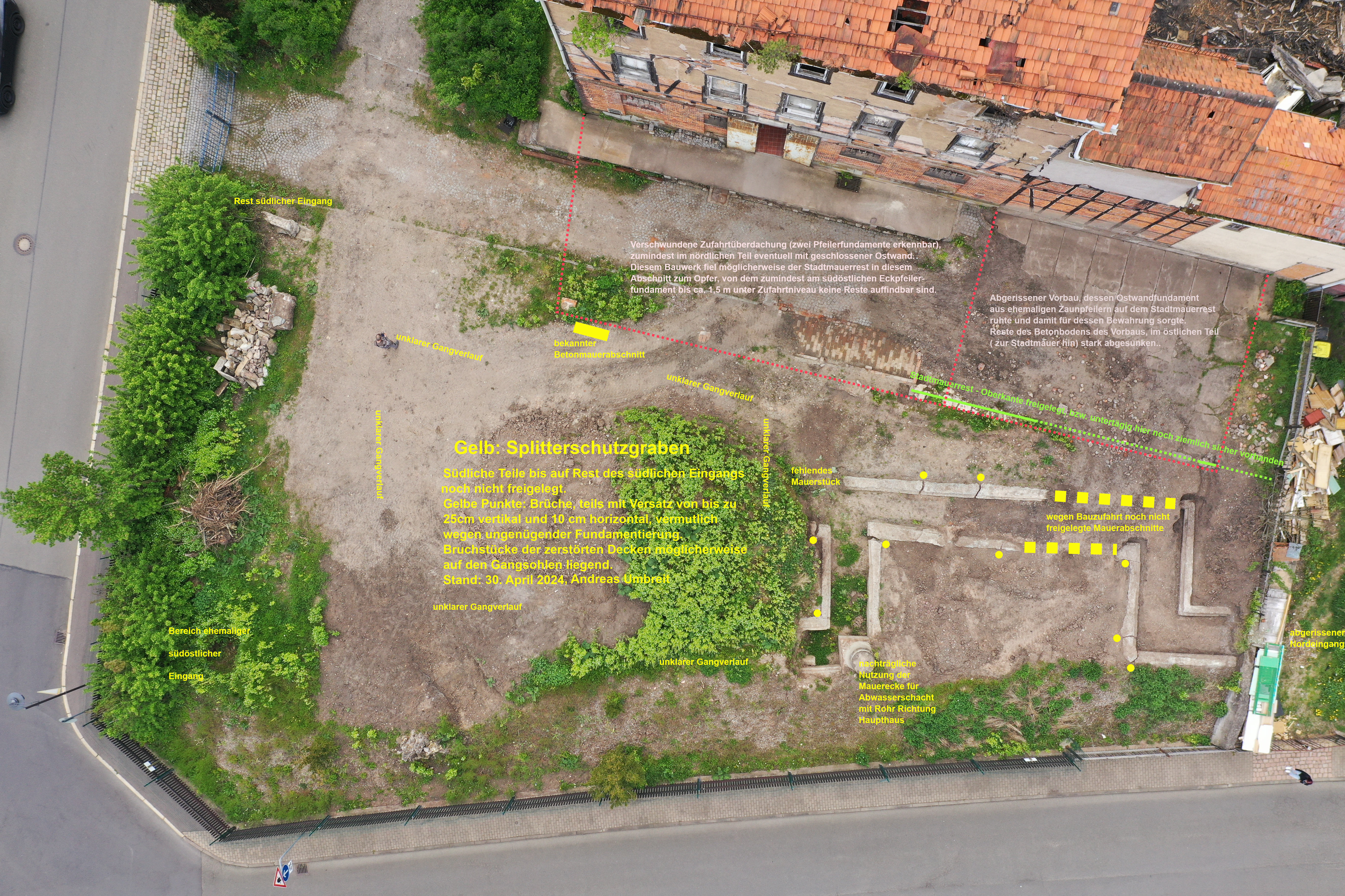 Über 800 Jahre Stadtgeschichte auf einem Ruinengrundstück: ein freigelegter Stadtmauerrest aus dem 12. Jh., ein vermutlich spätmittelalterlicher/frühneuzeitlicher Schachtbrunnen eines verschwundenem Ackerbürgeranwesens und bauliche Reste einer Lohgerberei aus dem 18. bis frühen 20. Jh. Von 1926 bis in die NS-Zeit als Kirche genutzt; teilweise finden sich freigelegte Reste von betoniertem Deckungsgraben aus dem 2. Weltkrieg.