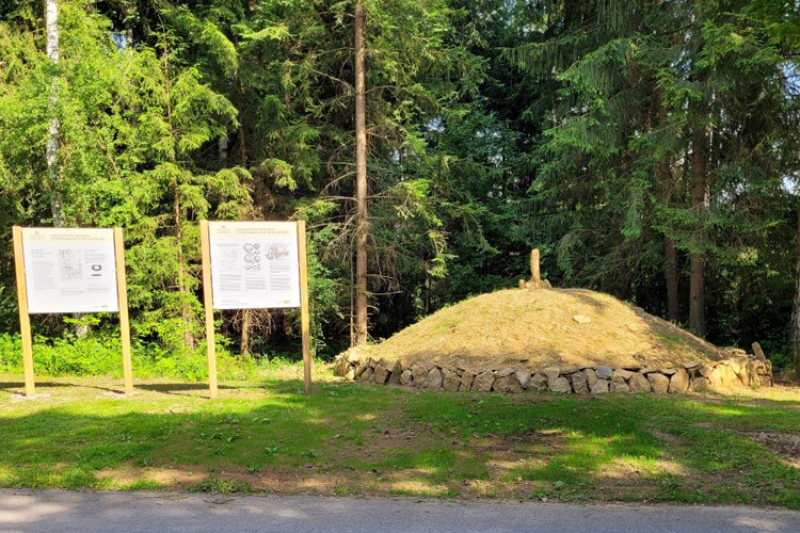Vorgeschichtliche Grabhügel im Umfeld. Ein rekonstruierter Nachbau ist mit Informationstafeln versehen.